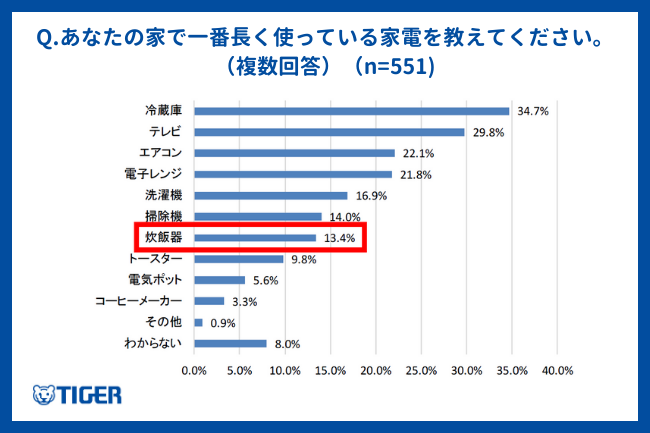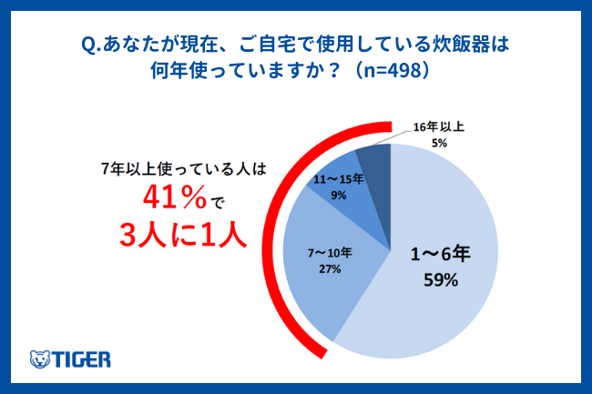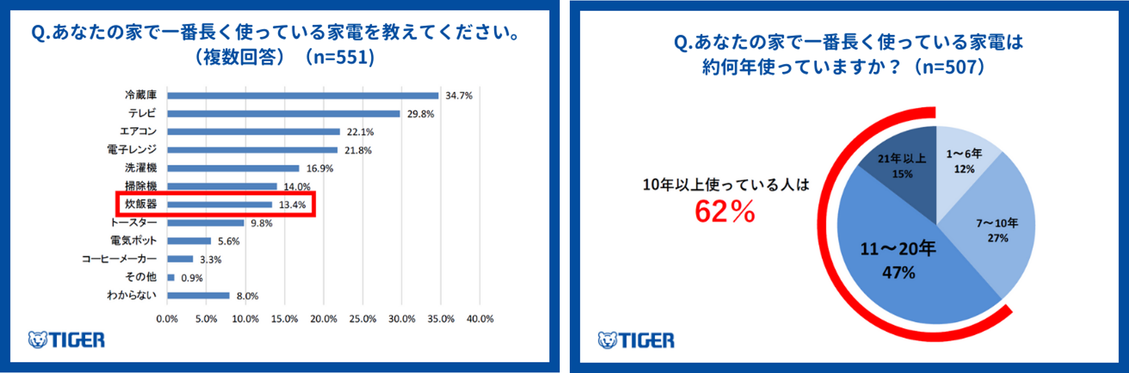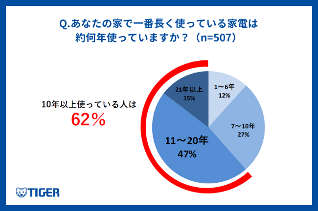 家の中で一番古い家電が10年より長い人は6割以上 3人に1人が炊飯器を7年以上使用していることが判明【タイガー魔法瓶 家電の買い替えと修理に関する調査シリーズ vol.1】