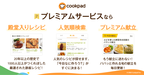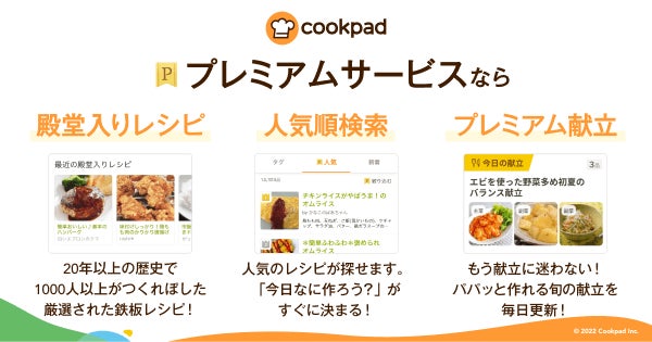 「クックパッドプレミアムサービス」に登録すると、栄養士が監修する「プレミアム献立」を閲覧できるほか、1,000件以上のつくれぽ*3が投稿されている「殿堂入りレシピ」や「人気順検索」などの機能を利用し、より効率的にレシピを探すことが可能になります。