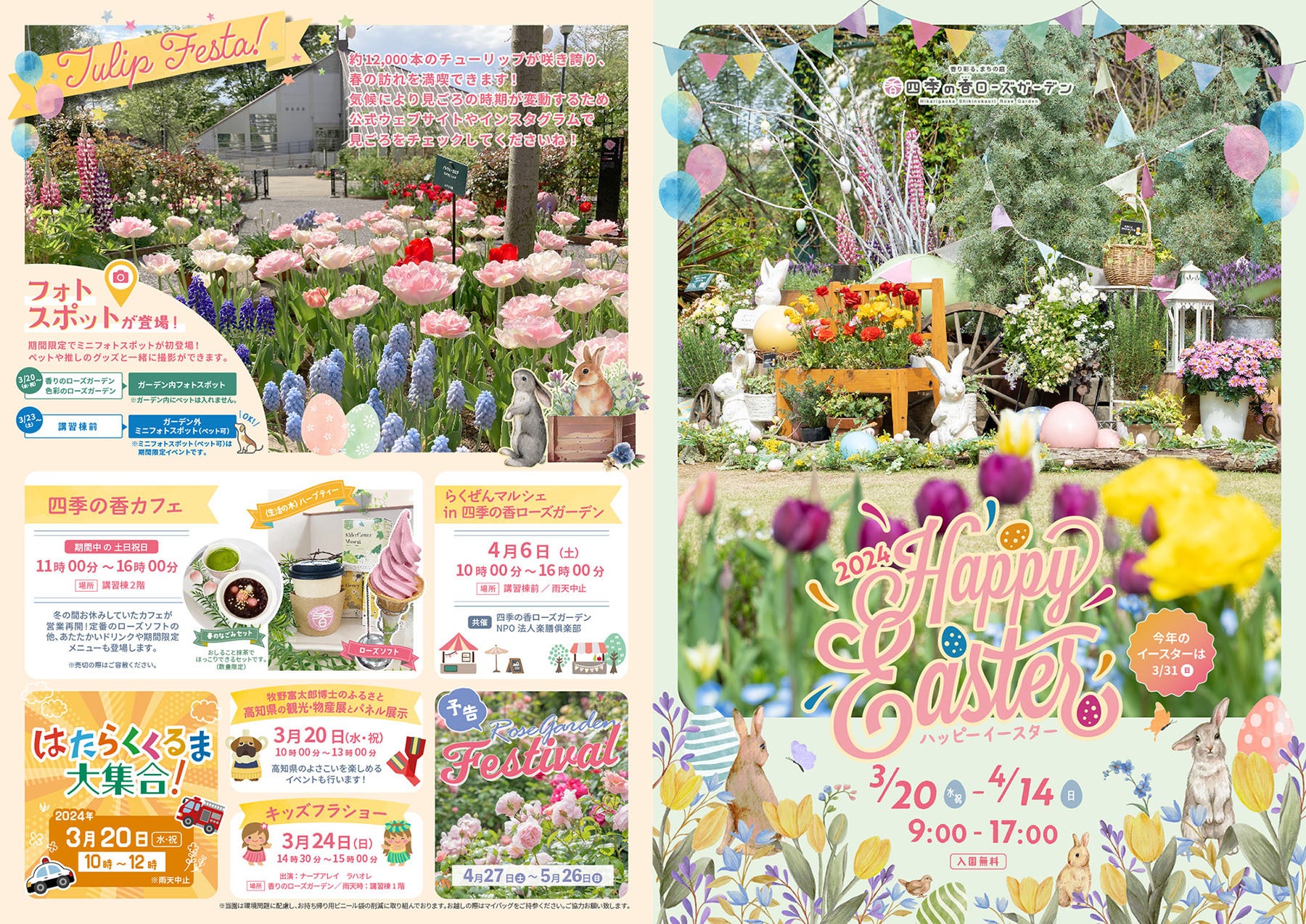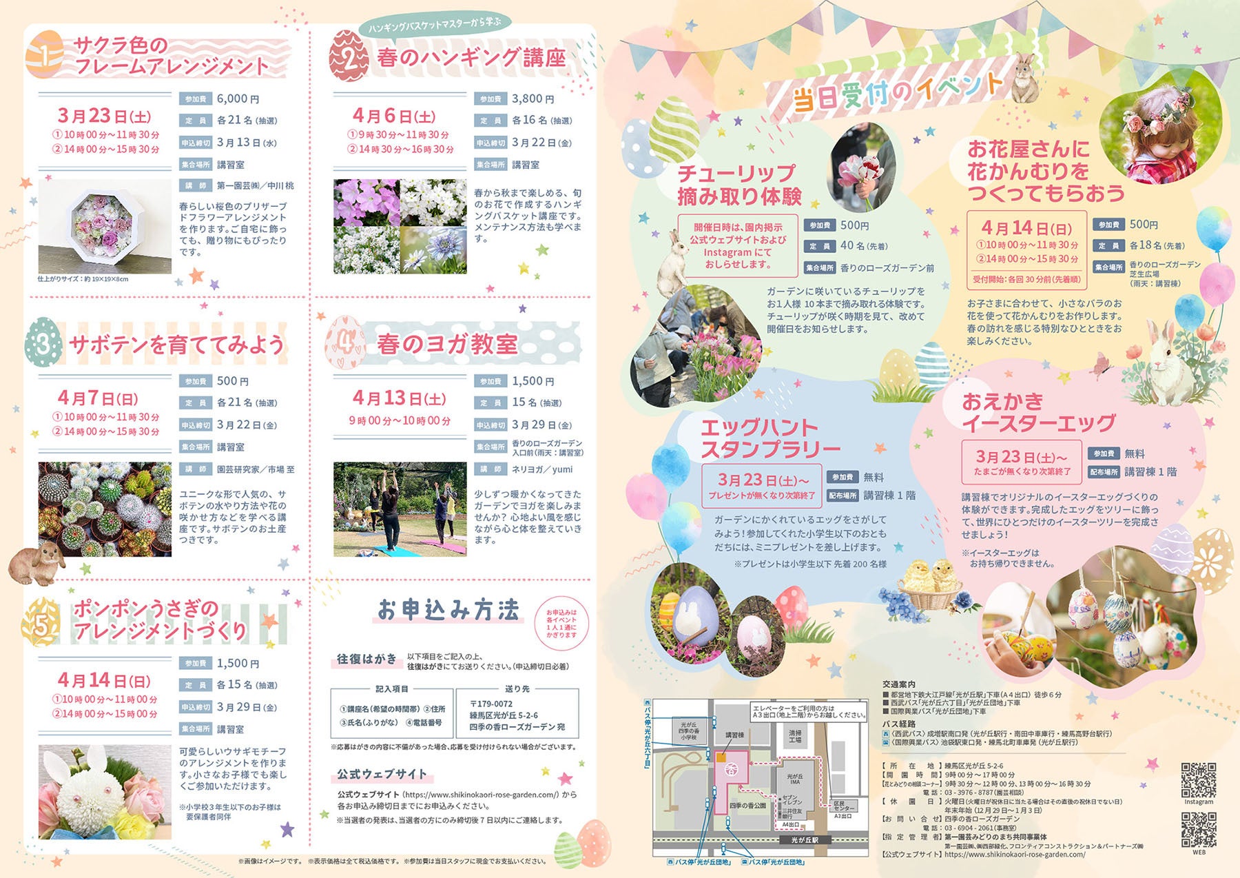 今年の園内では、昨年の10,000本を超える12,000本以上のチューリップが見ごろを迎えます。厳選した約80品種のカラフルなチューリップがガーデンを春色へと染め上げます。第一園芸のフローリスト中川桃がお子様に合わせてローズガーデンならではのバラの花かんむりを作るイベントや、各ガーデンのフォトスポットに加え、期間限定のペットと一緒に撮影できるミニフォトスポットを今年初めて設置します(ガーデン外)。昨年大好評だったチューリップの摘み取り体験や土日祝日限定営業の四季の香カフェでは、数量限定でおしること抹茶の和のスウィーツ「春のなごみセット」を販売します。駅にも近く入園無料ですので、お気軽にご家族やご友人とご来園ください。