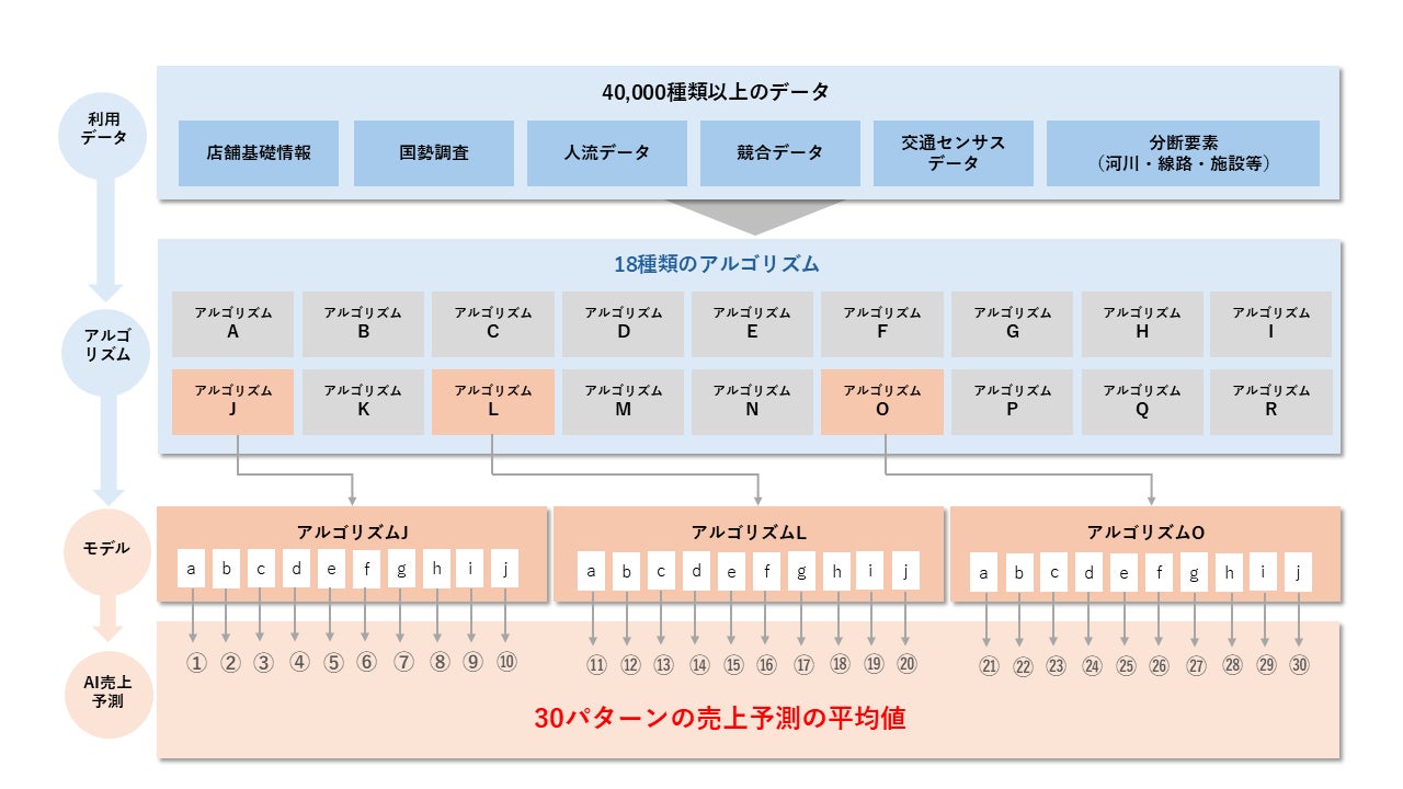 新規出店検討の際、店舗の広さや位置・形態等の店舗基礎情報、国勢調査、人流データ、交通センサスデータ、河川等の地理的情報などの4万以上のインプットデータをもとに約18種類のアルゴリズムの中から該当店舗のアルゴリズムを特定し、状況にあった30パターンの売上予測を算出。これらの平均値をとることで、新規出店店舗の年間の売上予測を立てていきます。