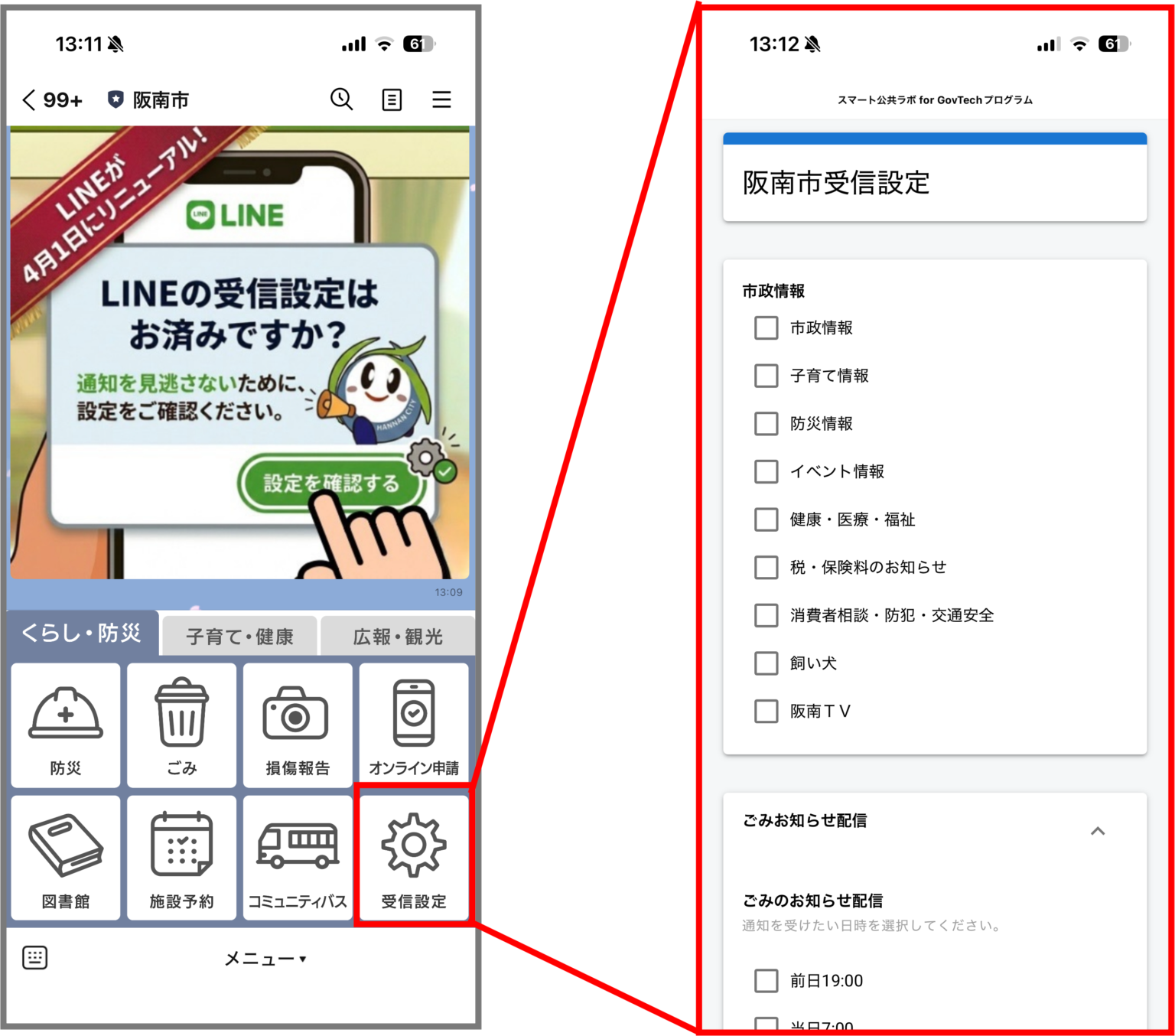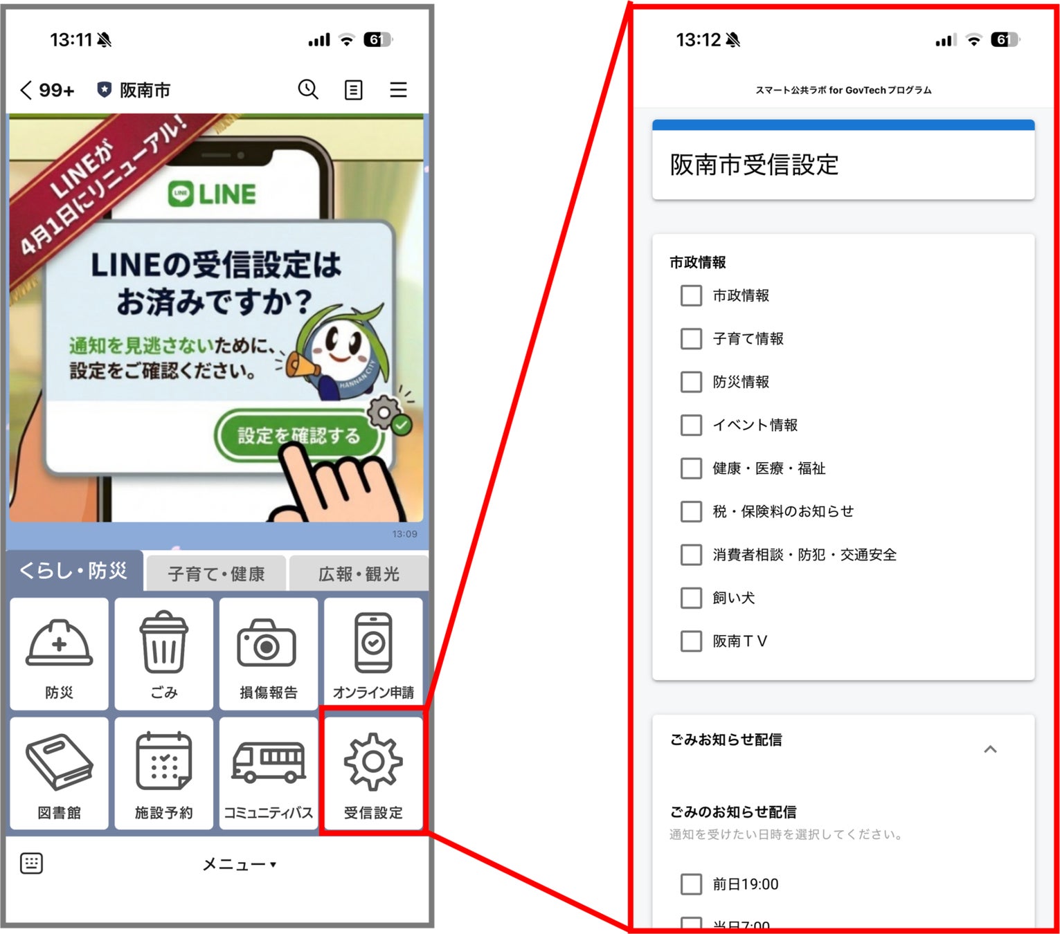 これまではLINEに登録している全ての住民に送られていた配信ですが、リニューアル以降は欲しい配信カテゴリーを「受信設定」に回答することでカスタマイズすることができます。住民がほしい情報に絞って配信ができるため、市からの情報発信がこれまで以上に効果的になることが期待されます。