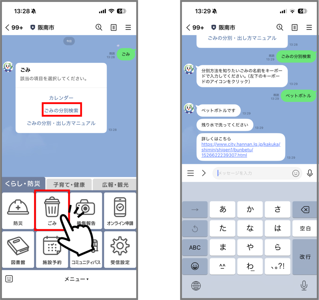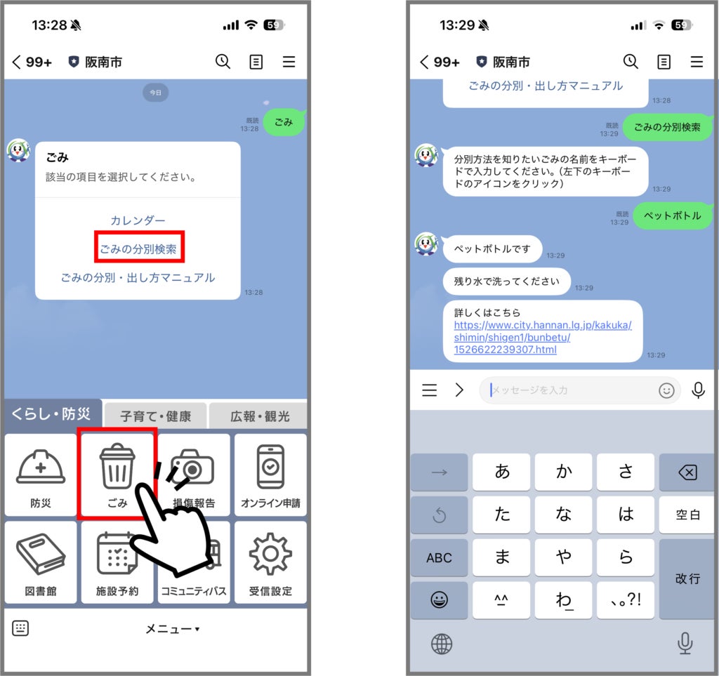 「ごみ」では、「ごみの一問一答機能」を搭載しております。LINEのトーク画面に直接「ペットボトル」「食品トレイ」などの破棄したいごみの具体名を入力することで、分別方法や捨てる際のコツを自動返答します。