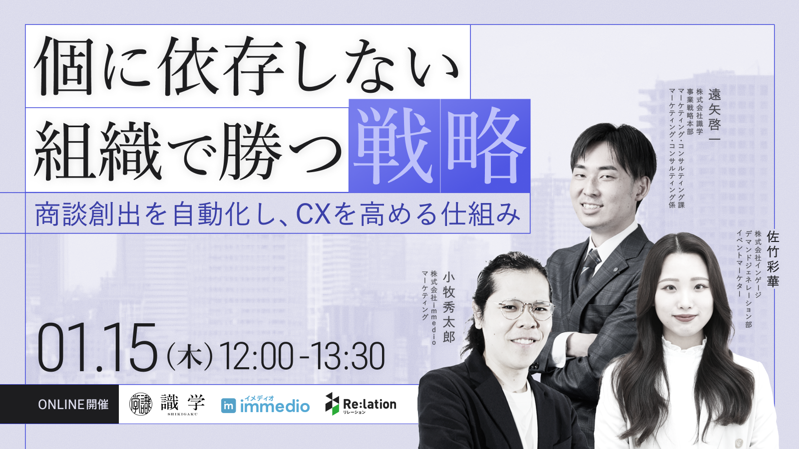 顧客対応クラウド「Re:lation(リレーション)」を提供し、6,000社以上(※1)の導入実績を誇る株式会社インゲージ(本社:大阪府大阪市、代表取締役社長:和田 哲也)は、2026年1月15日(木)に、株式会社識学、株式会社immedio マーケティングと共同で、ウェビナー「個に依存しない組織で勝つ戦略~商談創出を自動化し、CXを高める仕組み~」を開催することをお知らせします。
