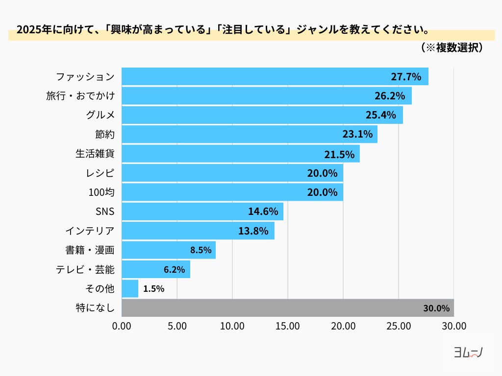 2)2025年の注目ジャンル1位はファッション(27.7%)!旅行・グルメが続く