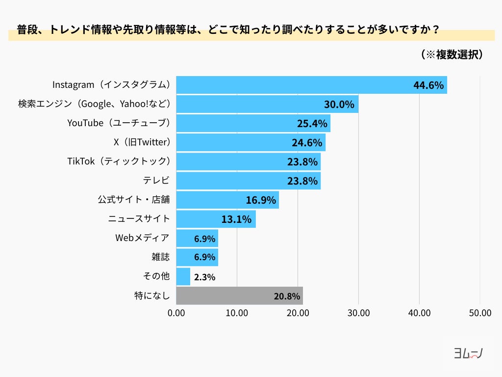 「Instagram(インスタグラム)」が44.6%で最も多く、次いで「検索エンジン(Google、Yahoo!など)」が30.0%、「Youtube(ユーチューブ)」が25.4%でした。