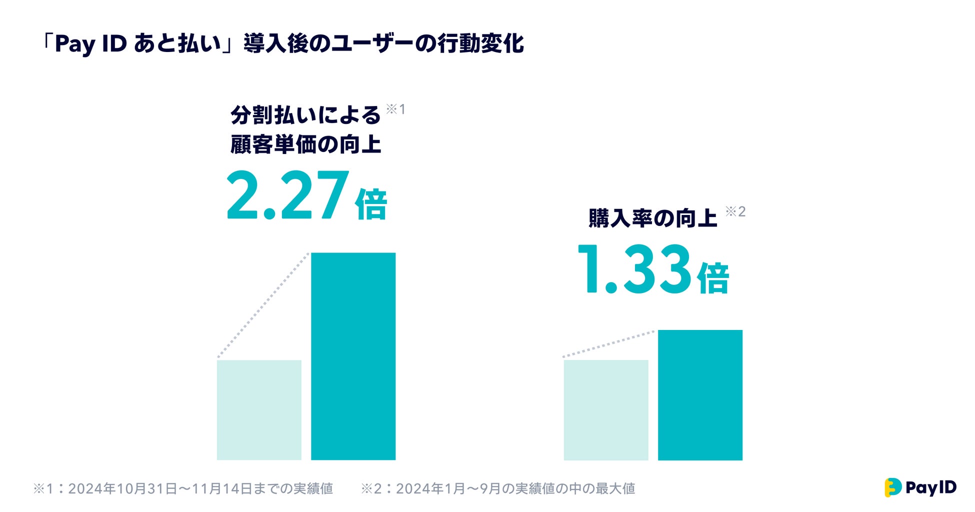 「Pay ID あと払い」を導入し、商品ページ内にあと払いの訴求を表示する「Pay ID あと払いウィジェット」を掲載することで、購入率が最大で1.33倍向上した(※2)という実績が出ています。分割払いも導入し、ウィジェットで訴求することで、さらなる購入率の向上が見込めます。