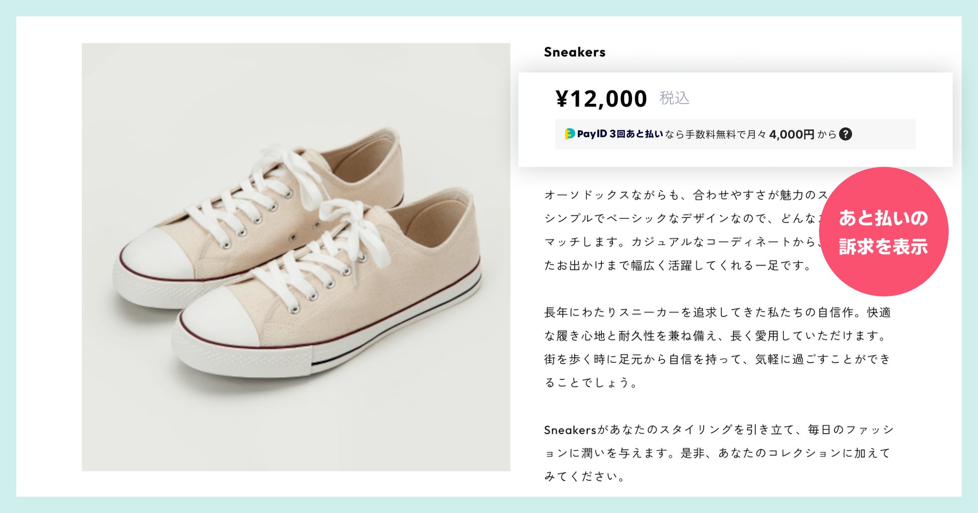 ・審査を通過されたショップは、商品ページ内に「Pay ID 3回あと払い」の利用案内バナーが表示されます。
