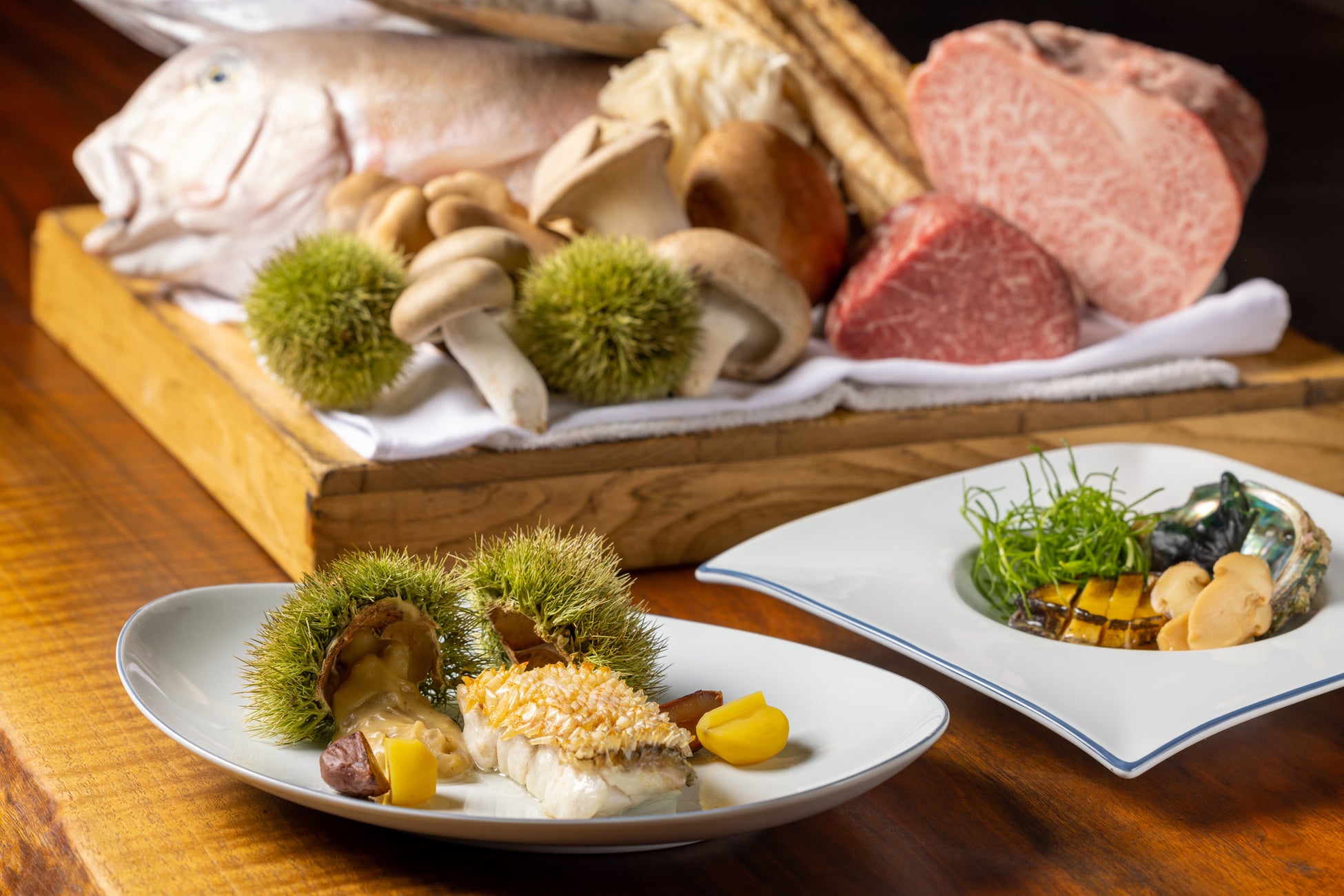 産地を厳選し旬にこだわった新鮮な食材をライブ感溢れる鉄板焼でお召し上がりいただける「けやき坂」では、秋の味覚の王様とも呼ばれる香り高い松茸や、高級魚として知られ甘みが強く上品な旨味がある甘鯛など、前菜から御飯物まですべてに松茸をつかうディナーコースが登場。鱗を落とさず焼くことでパリパリとした歯触りとふっくらと焼き上げられた身の食感のコントラストも楽しい甘鯛の鱗焼きは、国産の栗のピューレをつけてお楽しみいただけます。昆布を乗せて蒸し焼きにすることで旨みをたっぷりと吸わせた鮑には鰹出汁と焼いた松茸でとった出汁を合わせるなど、食材が持つ旨味を心ゆくまで楽しめるようにシンプルな調理法で仕上げます。丁寧な手仕事で仕上げる、珠玉のメニューのかずかずをご堪能ください。