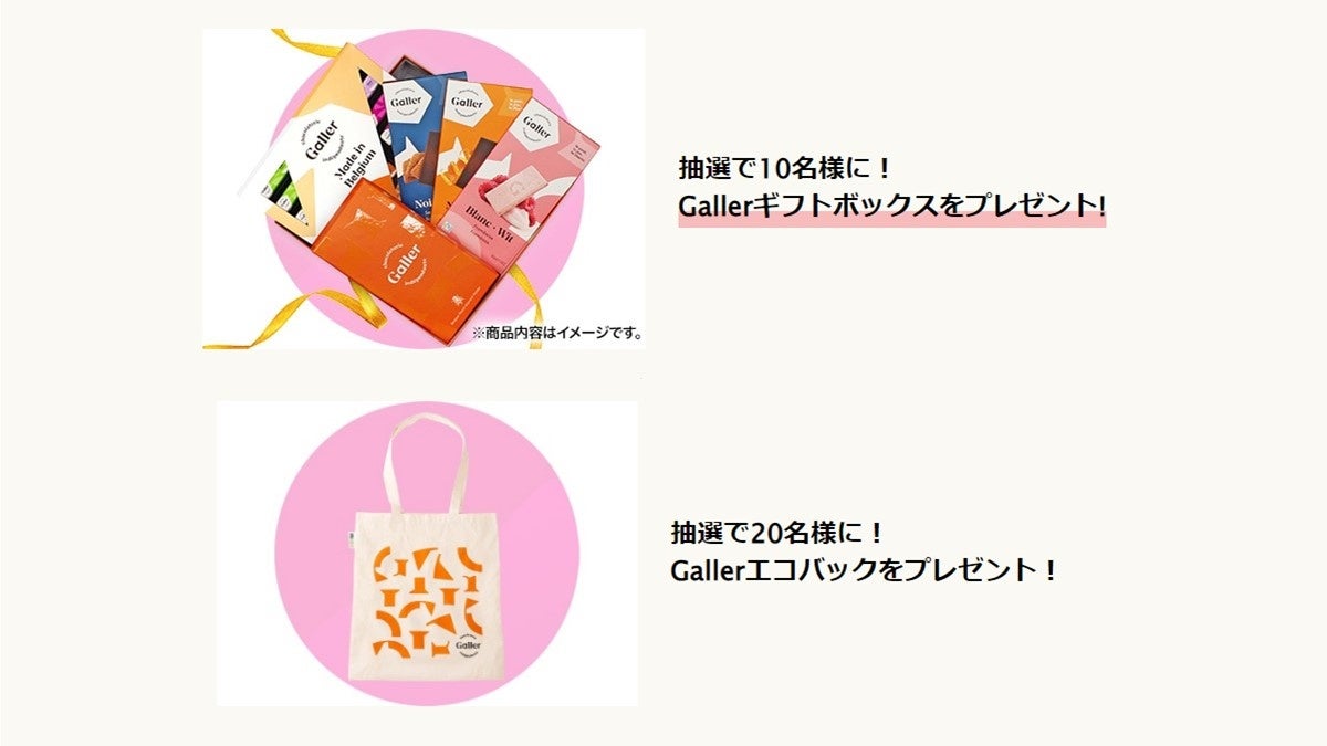 Galler(ガレー)チョコレート公式オンラインショップでは、先行予約期間中に公式オンラインショップにて対象商品をご購入いただいた方の中から抽選で10名様に5,000円相当の商品を詰め込んだガレーギフトボックスをプレゼントいたします。また、GallerはSGDsに則ってフェアトレードにより作られたチョコレートですが、皆さんに普段よりSGDsに関連したものを使って欲しいという思いで作られたGallerフェアトレードトートバックを抽選で20名様にプレゼントいたします。