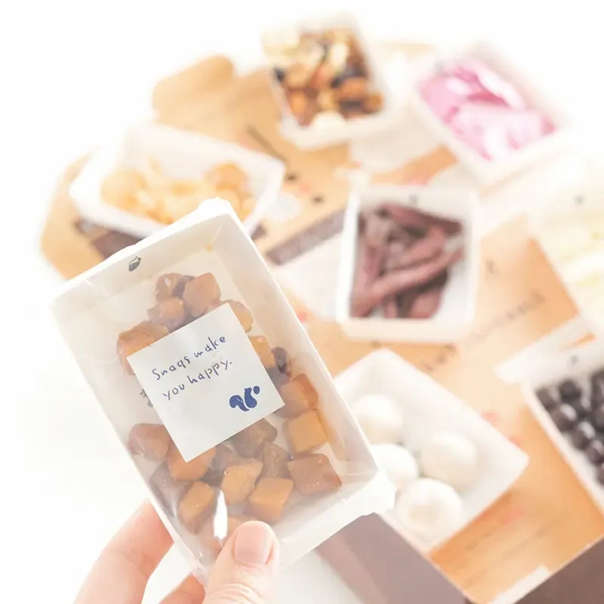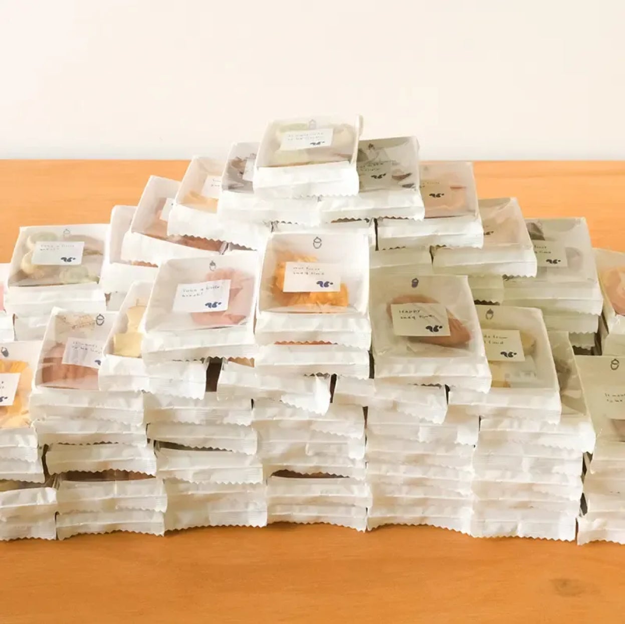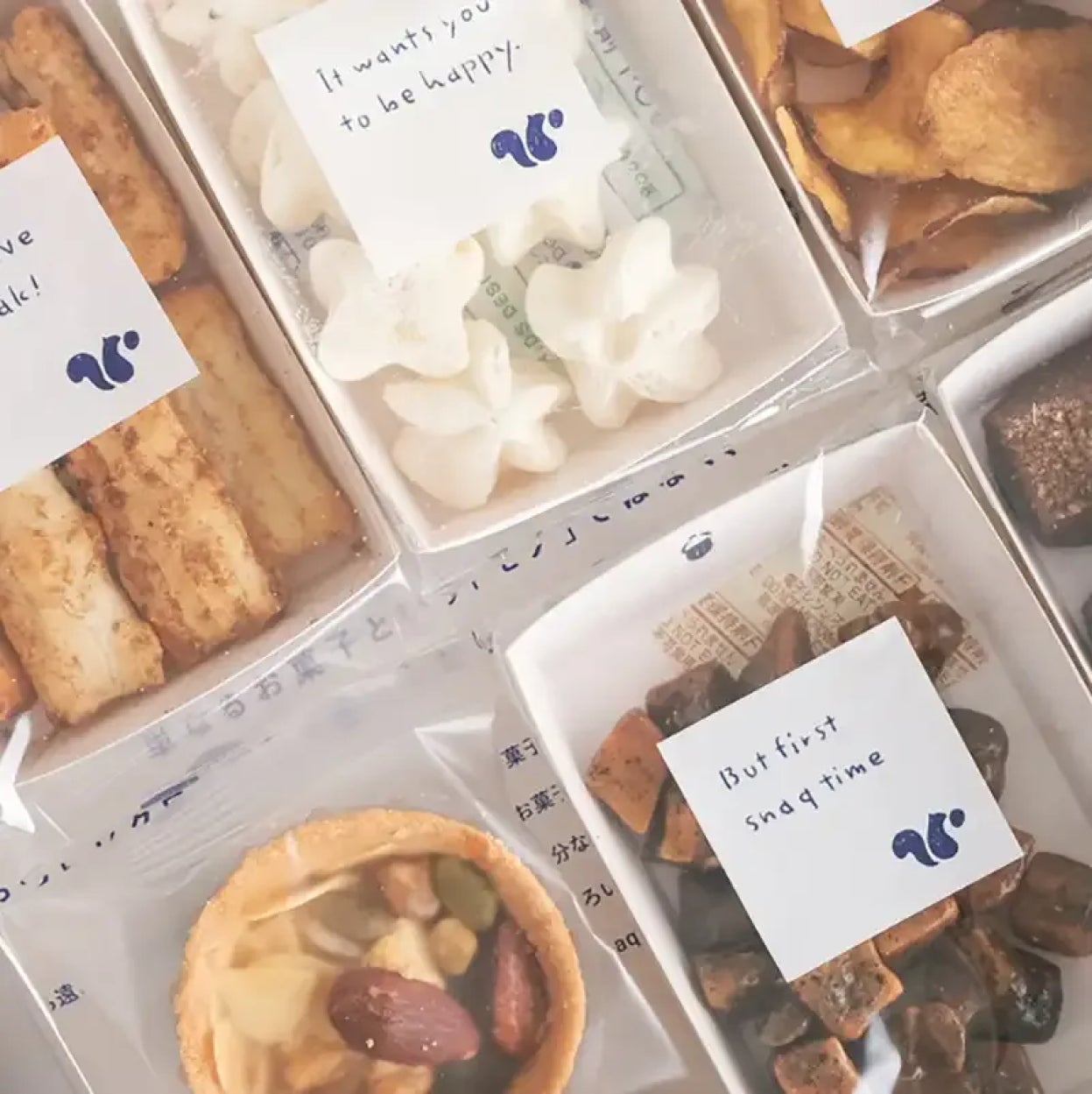 スナックミーオフィスのお菓子は、すべての商品開発において白砂糖・マーガリン・保存料・着色料などのよけいなものを使用しません。さらにレパートリーは常時100種類以上揃え、かつ定番の売れ筋商品に加えて月に約20種類近くの新作を生み出しています。初めて出会うおやつとの出会い・ワクワク感を継続的にお届けします。