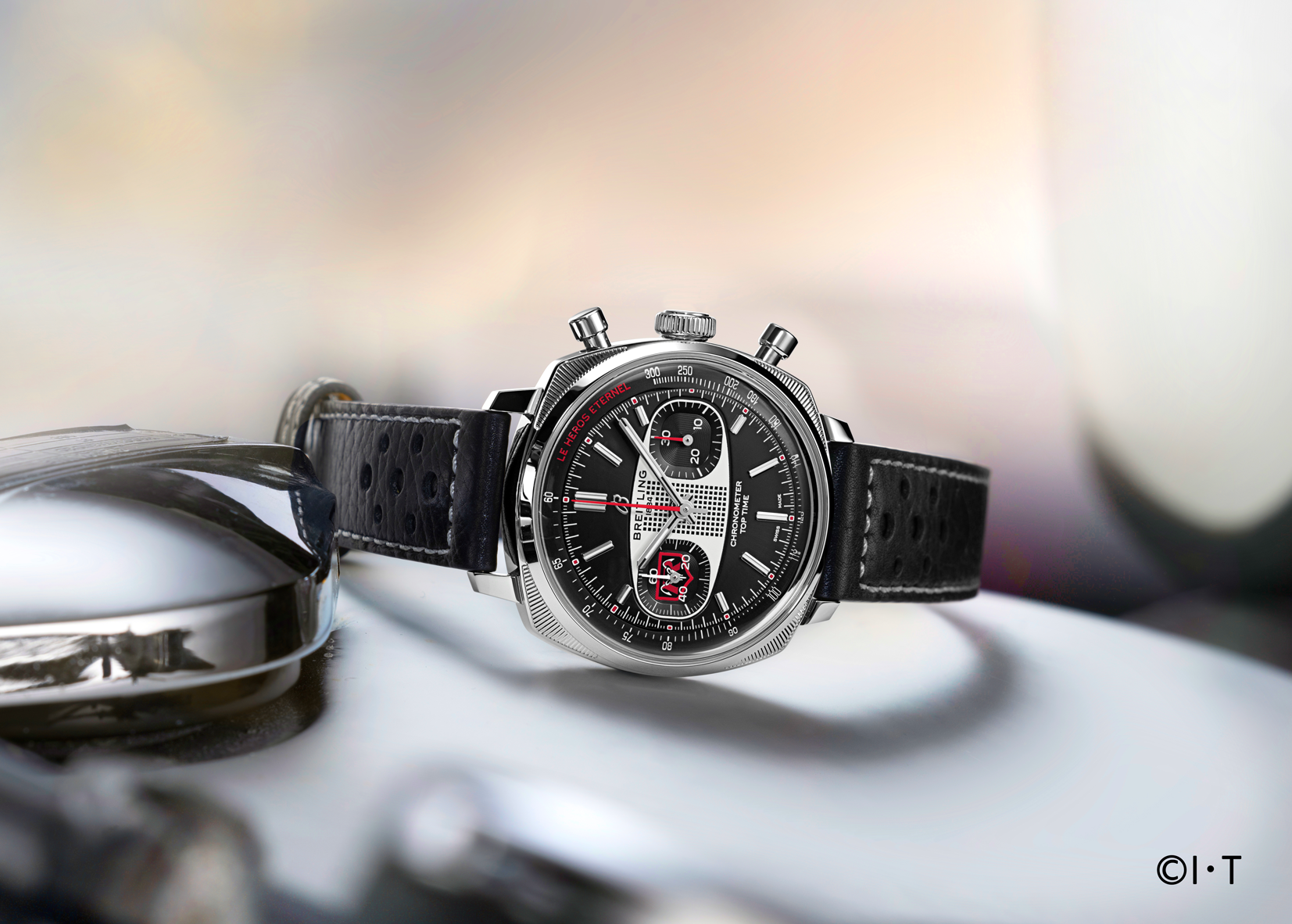 その自由で躍動感あふれる精神を受け継ぎ、「トップタイム B01 レーシング 仮面ライダー リミテッド」は、1971年に放映開始した仮面ライダー放映55周年を記念して誕生した日本限定モデルです。製造本数は周年にちなむ155本。9時位置のスモールセコンドにはさりげなくエンブレムを配し、文字盤外周には「LE HEROS ETERNAL(永遠のヒーロー)」の文字を刻みました。知る人だけが気づく、さりげないディテールです。