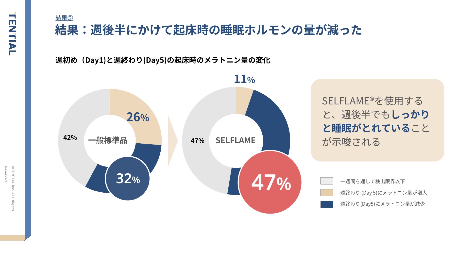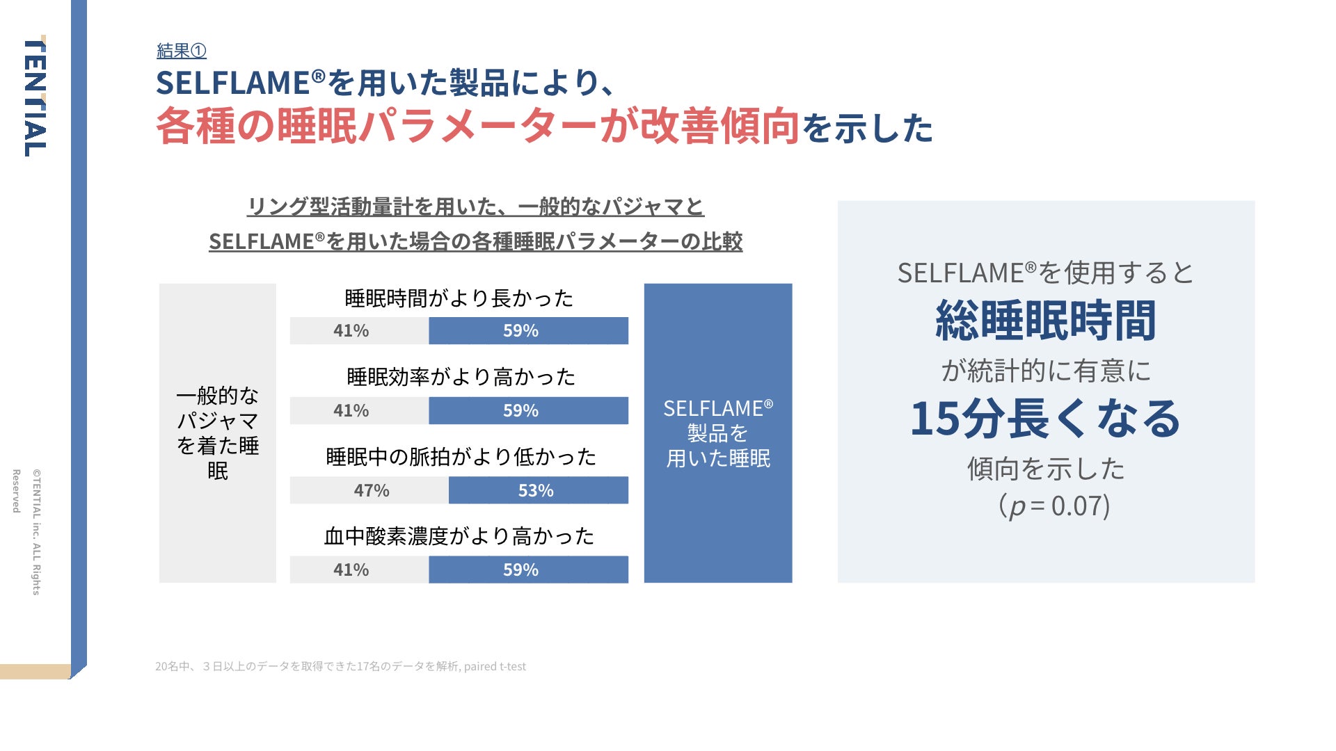 本検証は、普段の睡眠時にSELFLAME®を用いた製品を着用することで、日々の睡眠をサポートする可能性を示すものだと考えています。