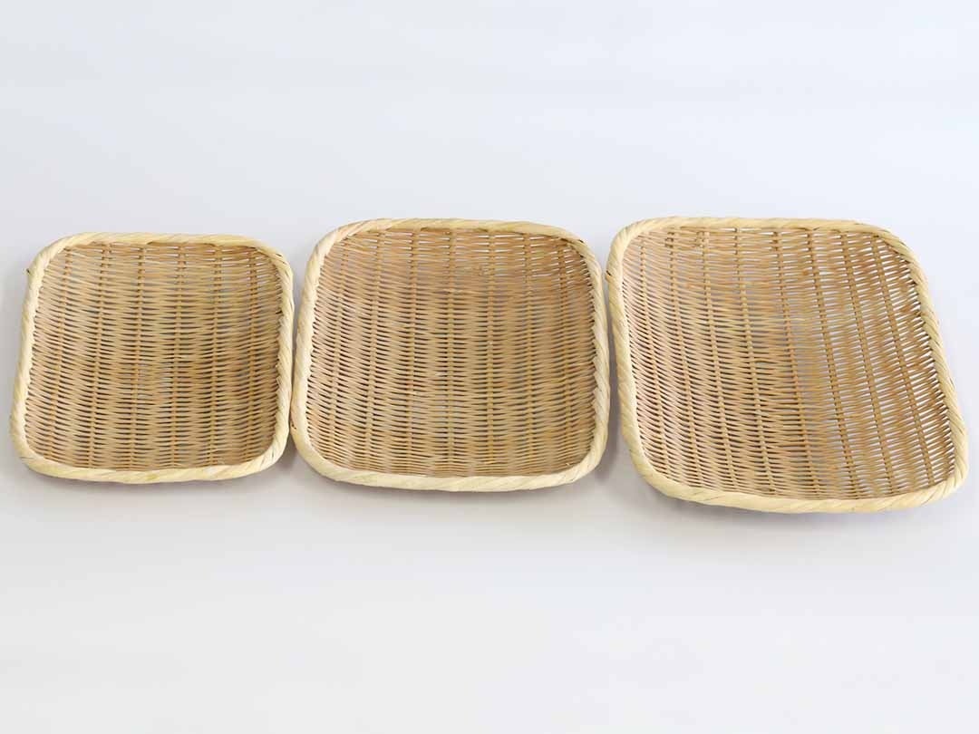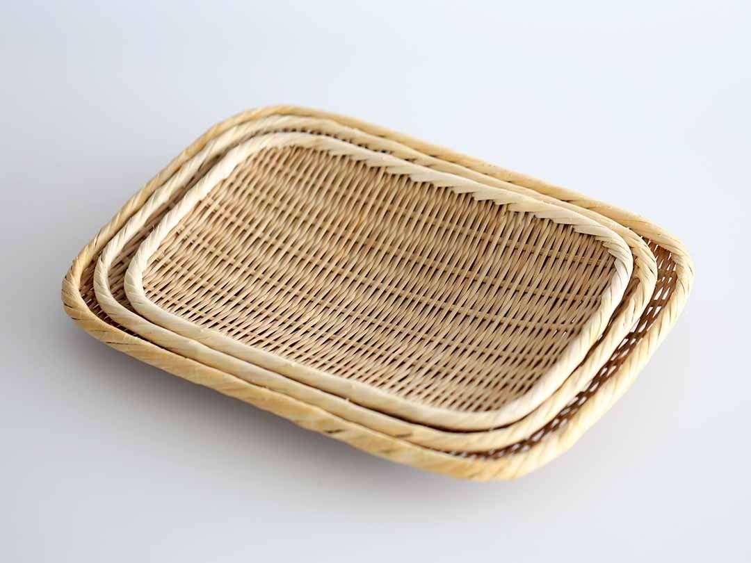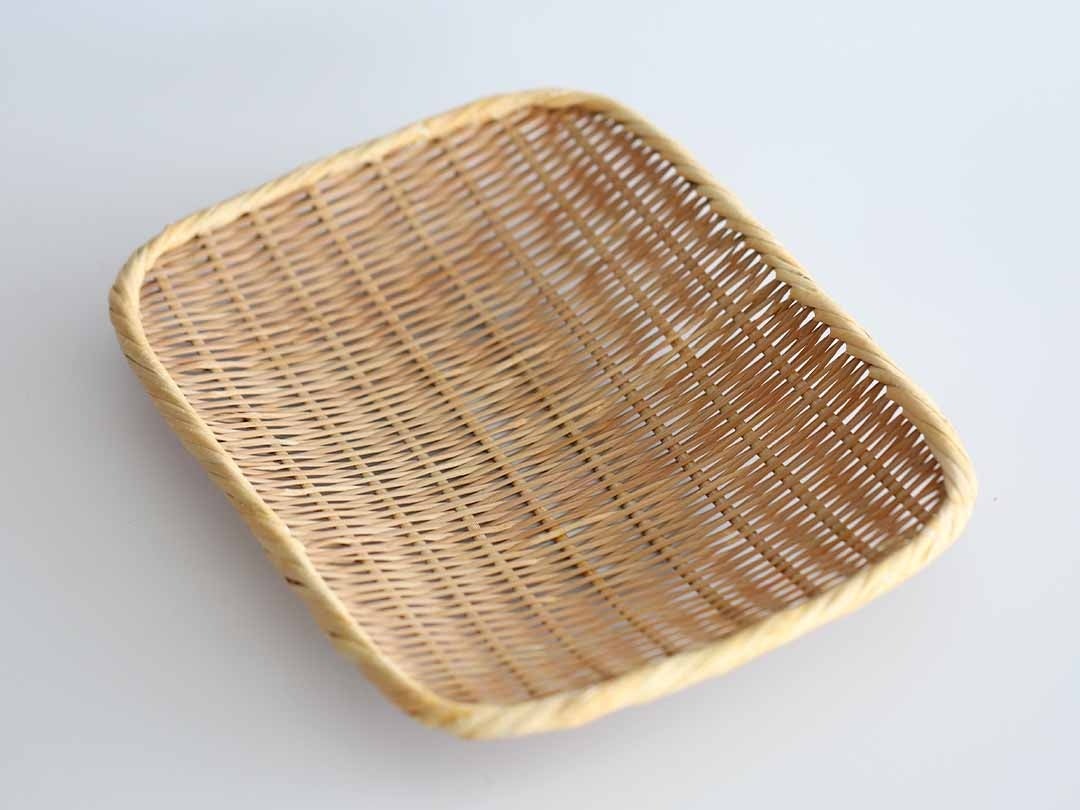今回お届けするのは、今ではほとんど作られることのなくなった、底に深さのある四角い形状の盆ざる。現代の一般的な盆ざるは平らで浅く、作業効率の面からも大量生産に適していますが、このオールド盆ざるは適度な深さがあり、内側が凹んでいることで水切れの良さが格段に向上しています。
