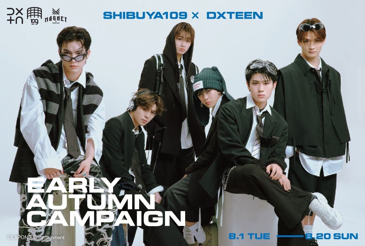 「SHIBUYA109渋谷店」「MAGNET by SHIBUYA109」、及び「SHIBUYA109阿倍野店」(大阪府大阪市)の3施設にて、2023年8月1日(火)~8月20日(日)の期間、5月にデビューした期待の新人6人組グローバルボーイズグループ「DXTEEN」(ディエックスティーン)をキャンペーンモデルに起用した『SHIBUYA109 × DXTEEN EARLY AUTUMN CAMPAIGN』を開催いたします。