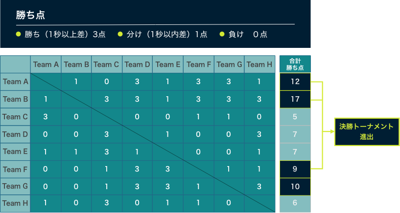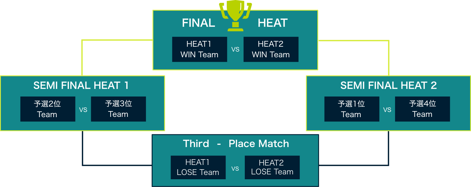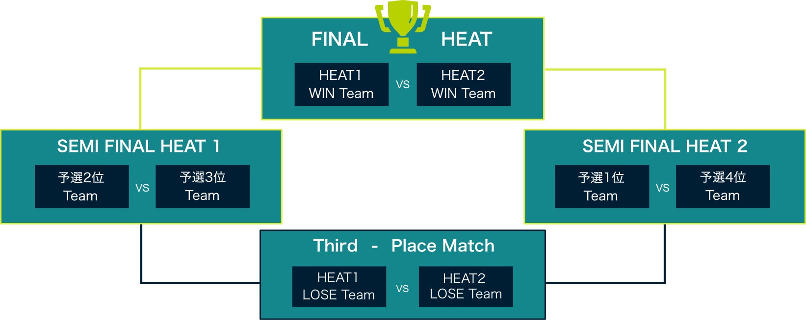 決勝トーナメントは、予選を勝ち上がってきた4チームによる1対1のトーナメント形式。セミファイナル(準決勝 HEAT 1、HEAT 2)は、各チーム1フライトを実施。予選期間中にセミファイナル用に計測したタイムを使用して対戦。HEAT 1とHEAT 2の各勝者がファイナル(決勝)へ進出。ファイナル(決勝 FINAL HEAT)は2チームで最終決戦を実施。予選期間中にファイナル用に計測したタイムを使用して対戦。勝者が大会の優勝となります。