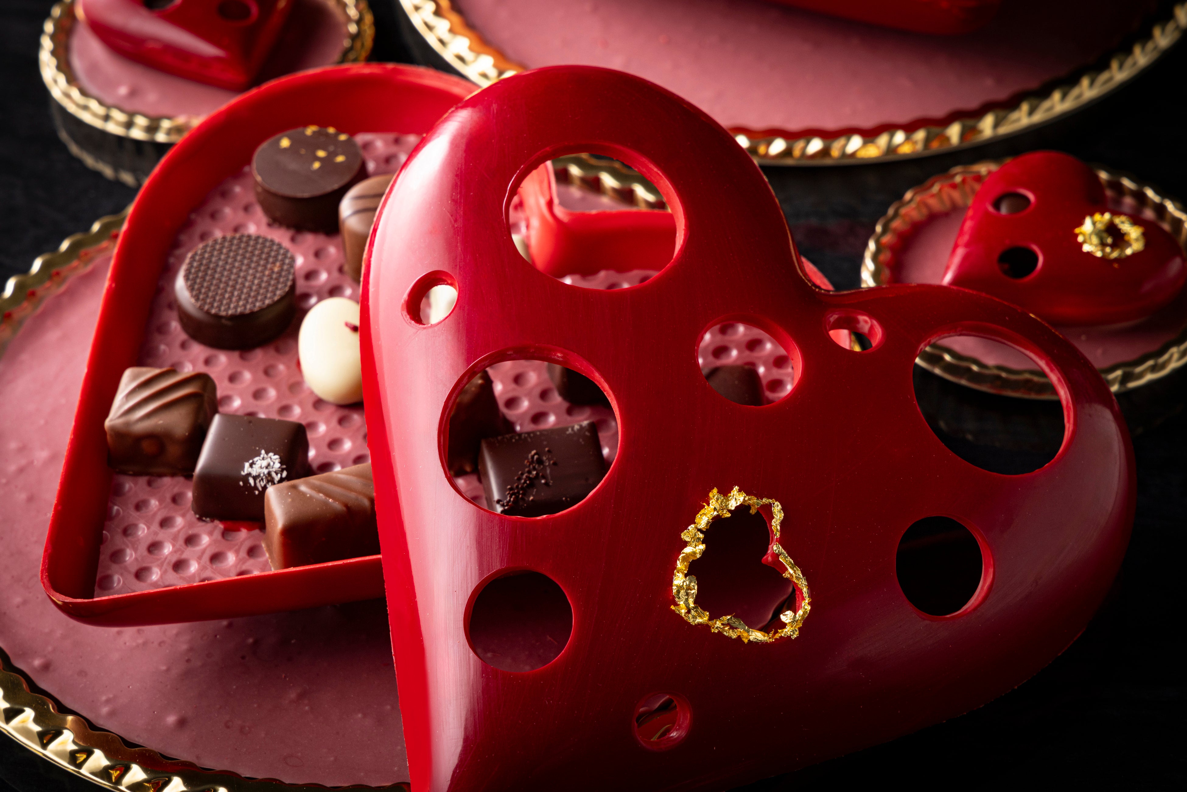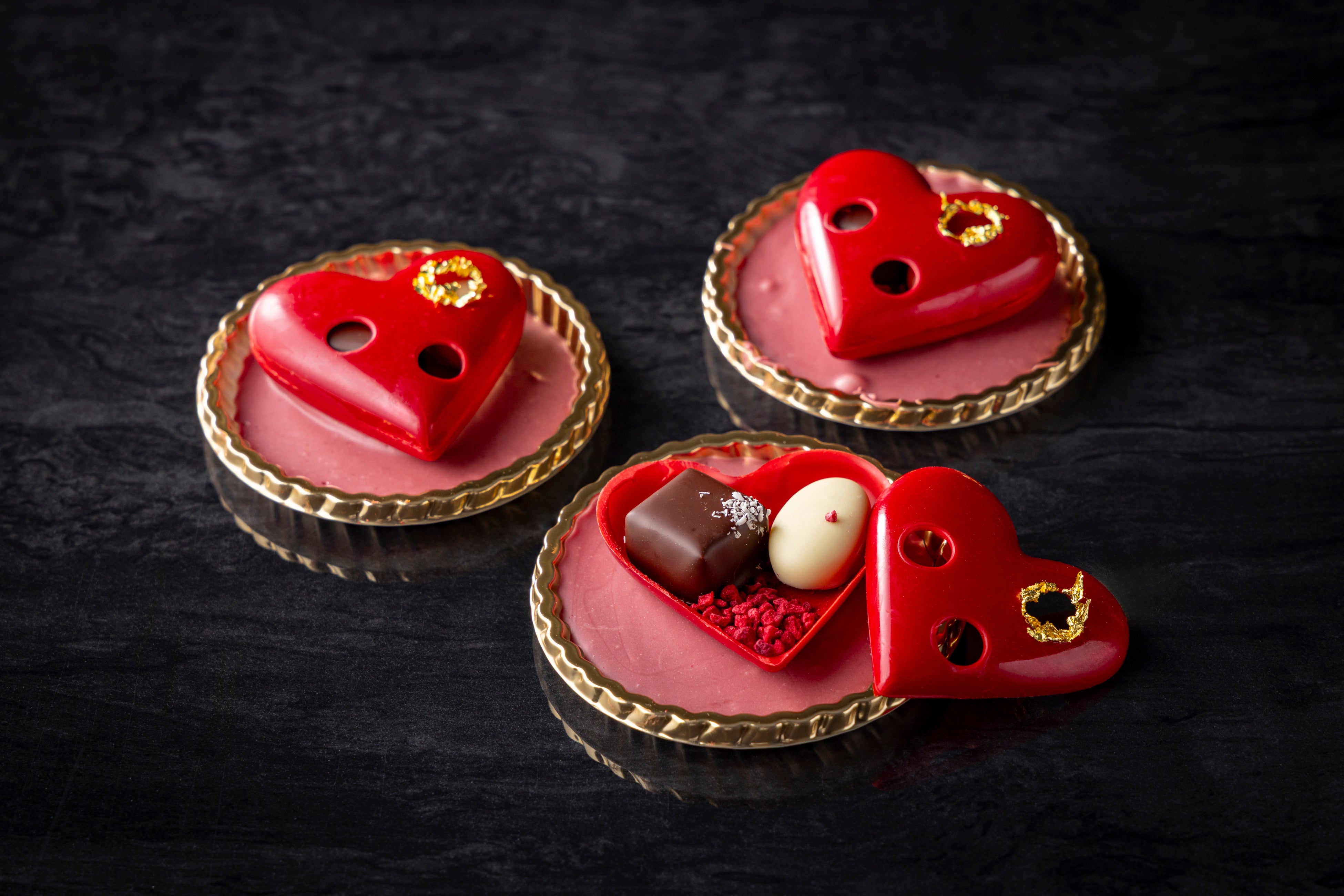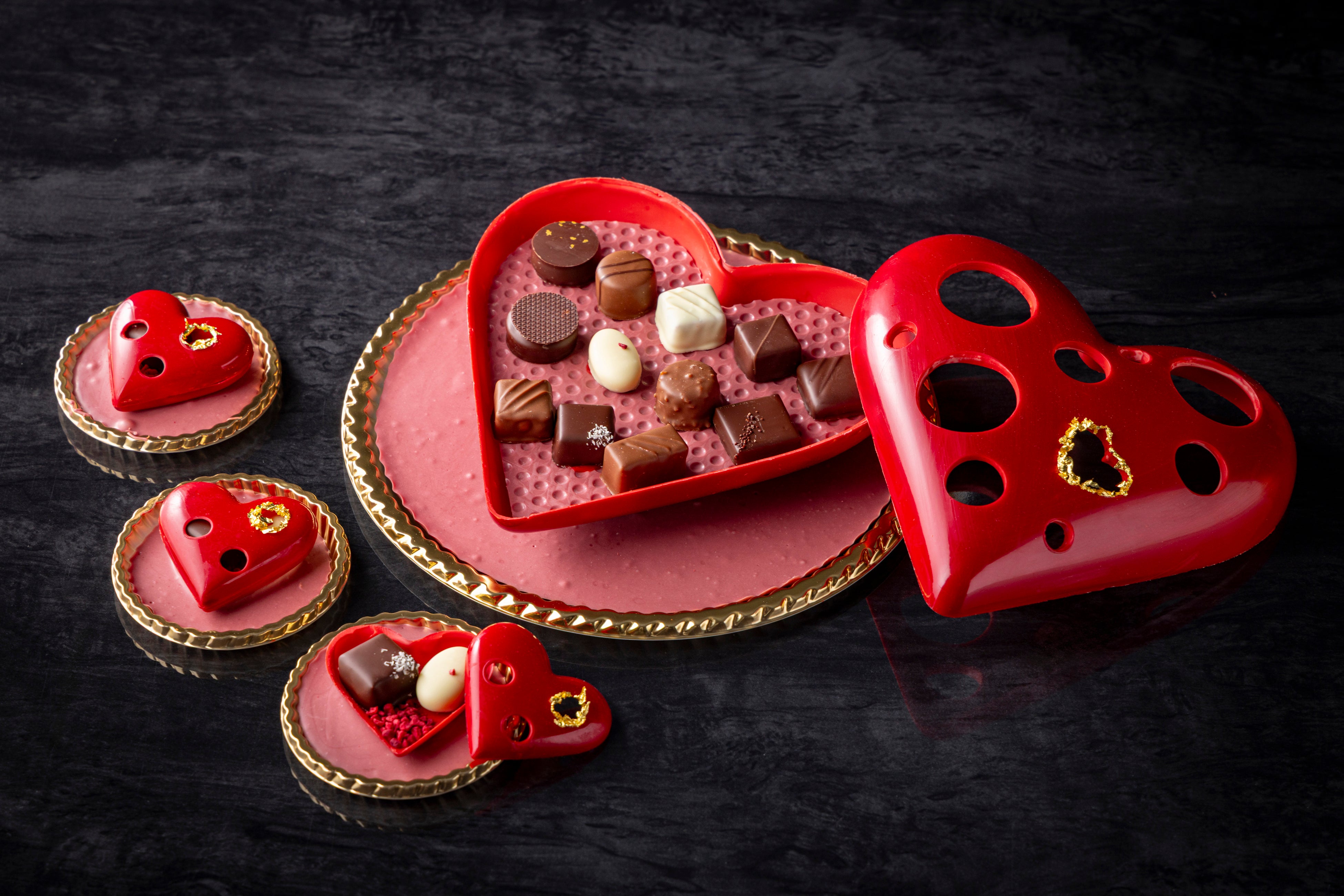 「ビジューハート」は、直径約20cmのLサイズと約6.5cmのSサイズで展開する艶やかな深紅のハート型ショコラ。ハート部分にはフェルクリン社のオーパスホワイト35%、ベースにはバリーカレボー社のルビーチョコレートを組み合わせ、まろやかなコクとルビーならではのフルーティーな酸味がふわりと広がる味わいに仕立てました。ハートの隙間から顔を覗かせるボンボンショコラと金粉のきらめきが、特別なギフトにふさわしい華やかさを添えます。