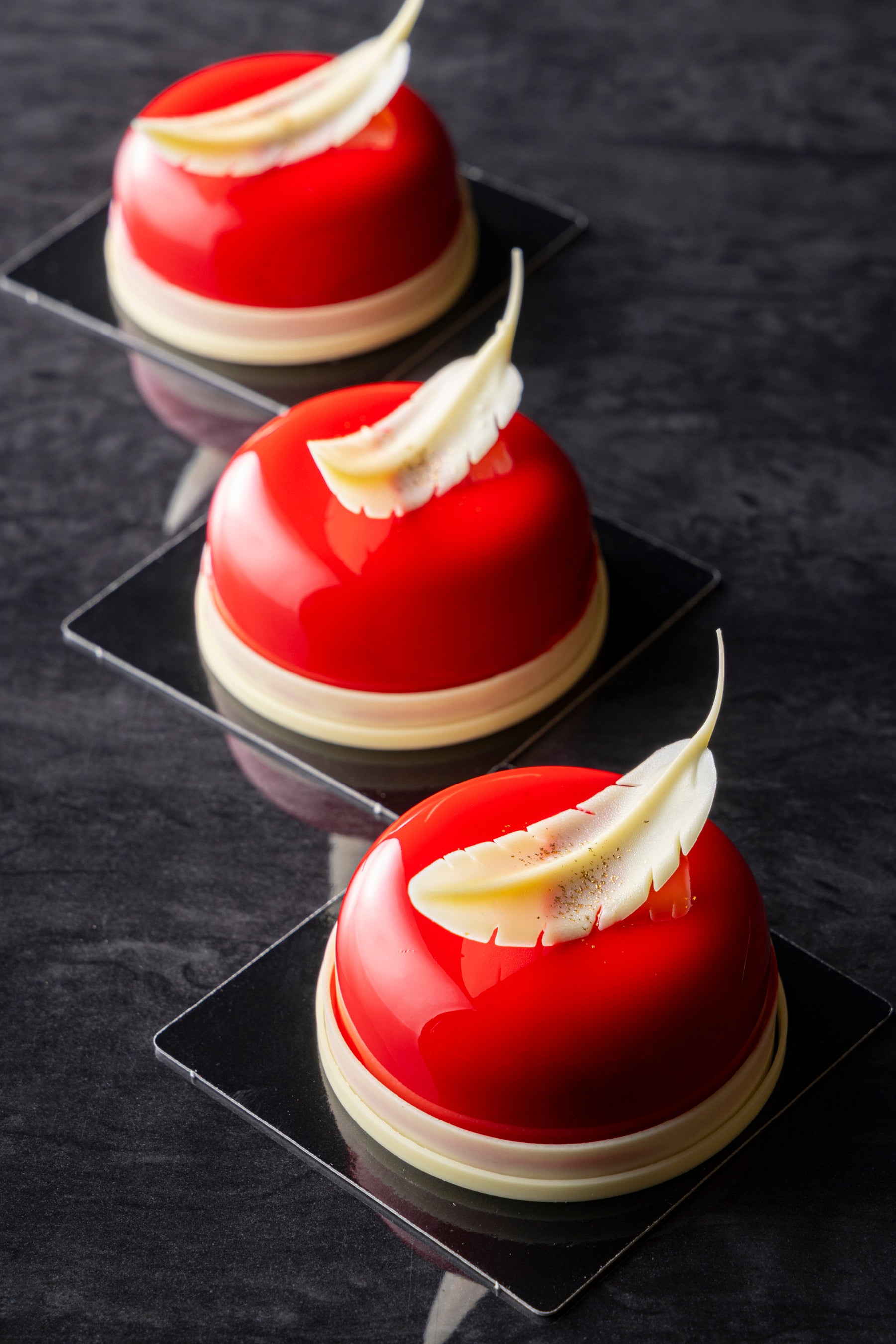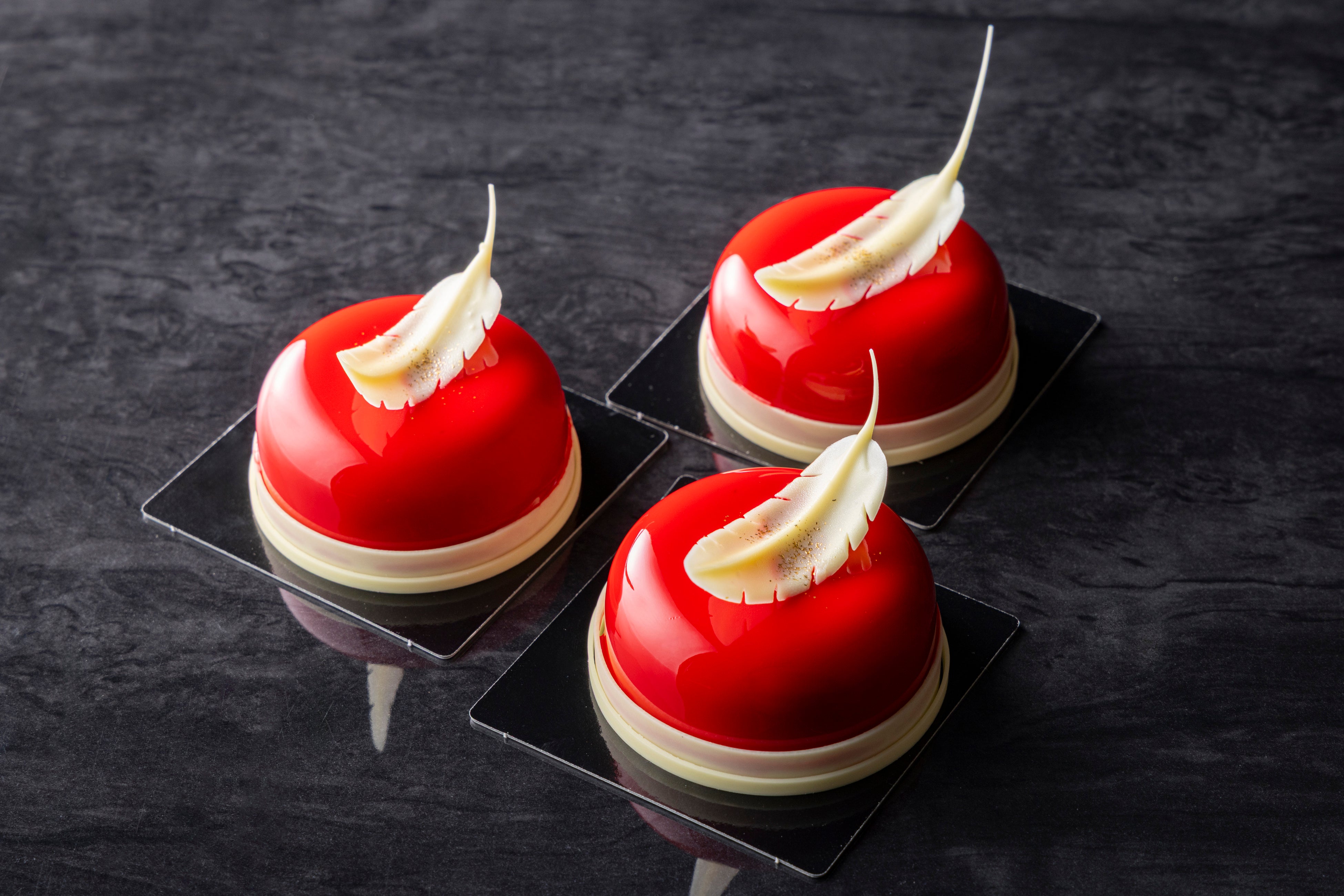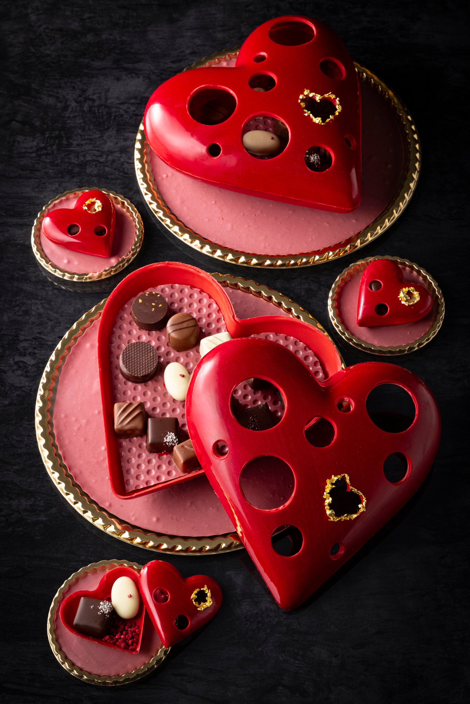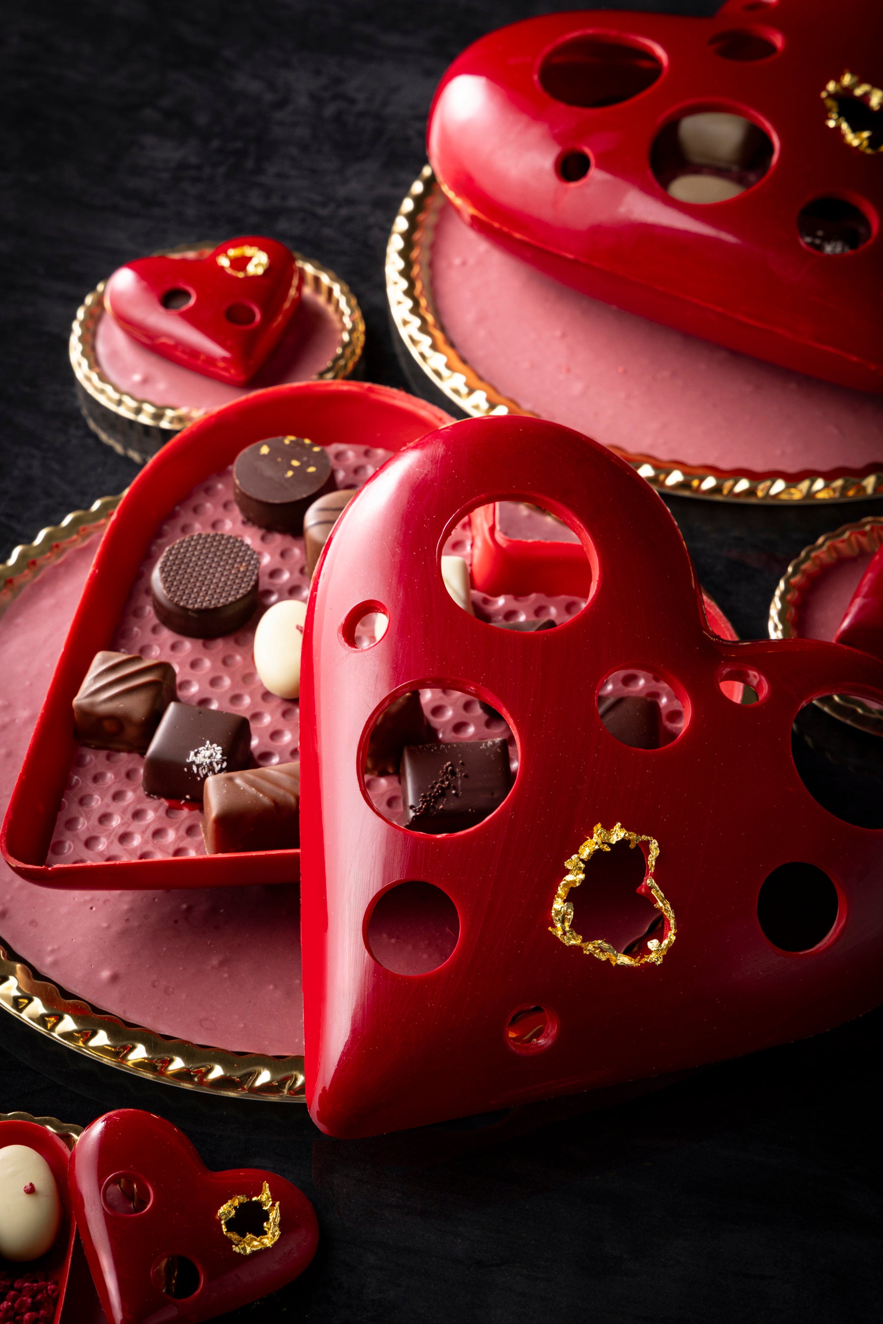 「ビジューハート」は、直径約20cmのLサイズと約6.5cmのSサイズで展開する艶やかな深紅のハート型ショコラ。ハート部分にはフェルクリン社のオーパスホワイト35%、ベースにはバリーカレボー社のルビーチョコレートを組み合わせ、まろやかなコクとルビーならではのフルーティーな酸味がふわりと広がる味わいに仕立てました。ハートの隙間から顔を覗かせるボンボンショコラと金粉のきらめきが、特別なギフトにふさわしい華やかさを添えます。