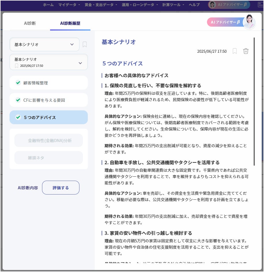 今回新たに搭載されたAIアドバイス機能 β版は、顧客情報とシミュレーション結果を分析し、AIが具体的なアドバイスを提示するものです。収入や支出などの情報を入力した上で、画面上のAIアドバイザーボタンを押下すると利用できます。この機能により、顧客の金融特性やライフプランをより深く分析し、現在だけでなく未来を見据えたアドバイスが可能となります。