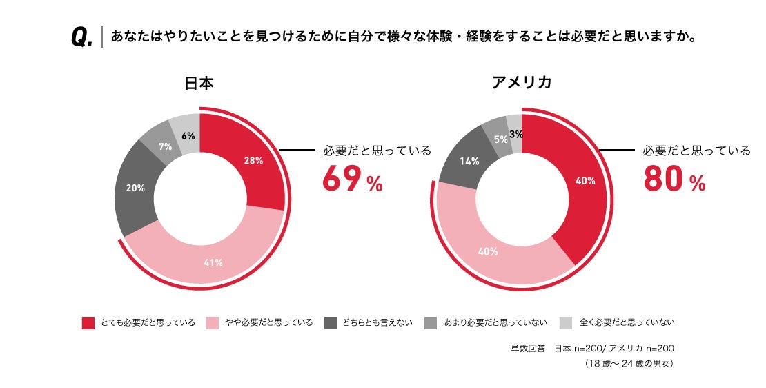 やりたいことをみつけるための体験・経験の必要性を聞いたところ、「とても必要だと思っている」「やや必要だと思っている」と回答した次世代層は、日本が69%、アメリカは80%にのぼりました。