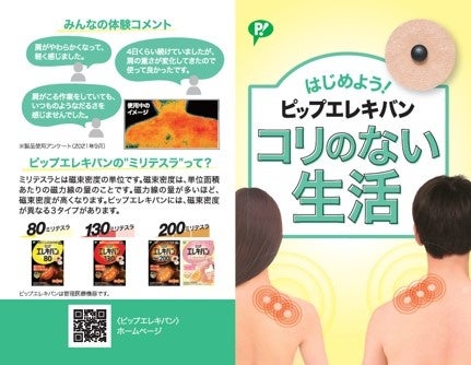 本リーフレットでは、ピップエレキバンの製品特徴やおすすめの貼り方、使用者の体験コメント等を紹介しているため、ご使用時の参考にしていただけます。