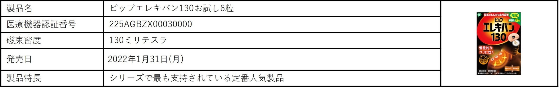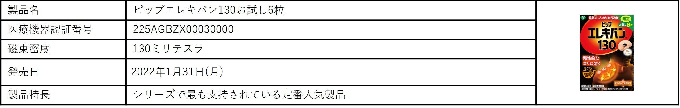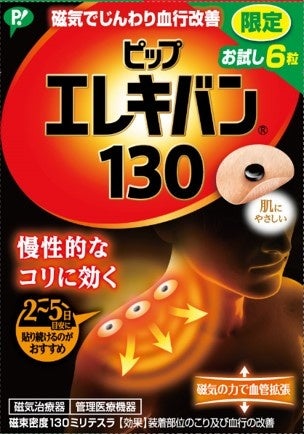 ピップ株式会社(本社:大阪市中央区、代表取締役社長:松浦由治)は、磁気の力で血行を改善しコリをほぐす磁気治療器「ピップエレキバン」シリーズより、小容量で試しやすい「ピップエレキバン130お試し6粒」を、2022年1月31日(月)から全国のドラッグストアにて数量限定で販売を開始します。