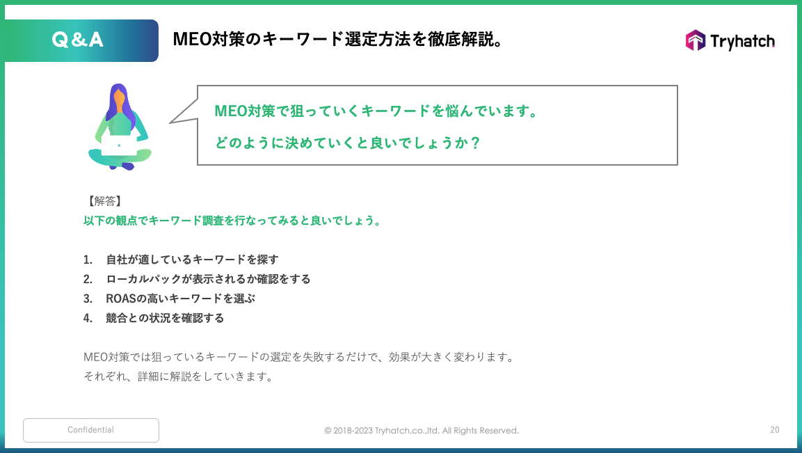 当月のFAQ、MEO対策の効果を左右するキーワード選定について回答をしています。
