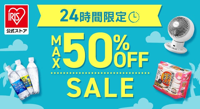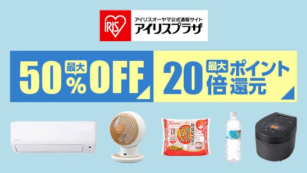 アイリスプラザの商品が、最大50%割引でおトクにお買い物いただけるアウトレットセールを開催します。そのほか期間中に対象商品をご購入いただくと、最大20%のポイント還元や最大50%割引セール、おトクな割引クーポンをご用意します。