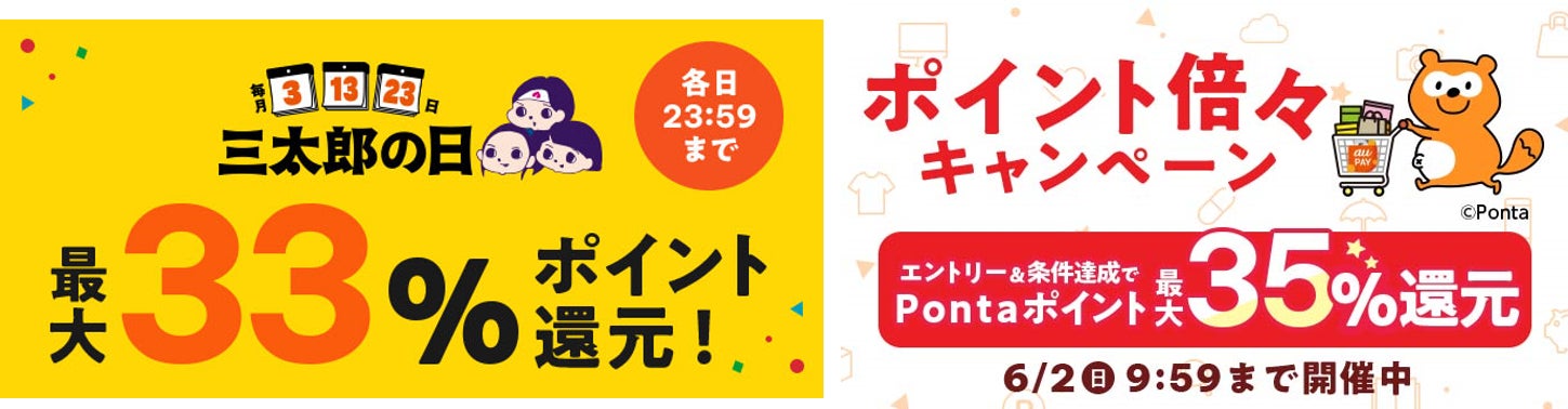 特典内容 | 特典①最大33%ポイント還元 au PAY マーケットのお買い物でau PAY カードでお支払いいただくと、最大5%のPontaポイント(au PAY マーケット限定)を還元します。 通常の特典とあわせて最大33%のポイント還元となります。