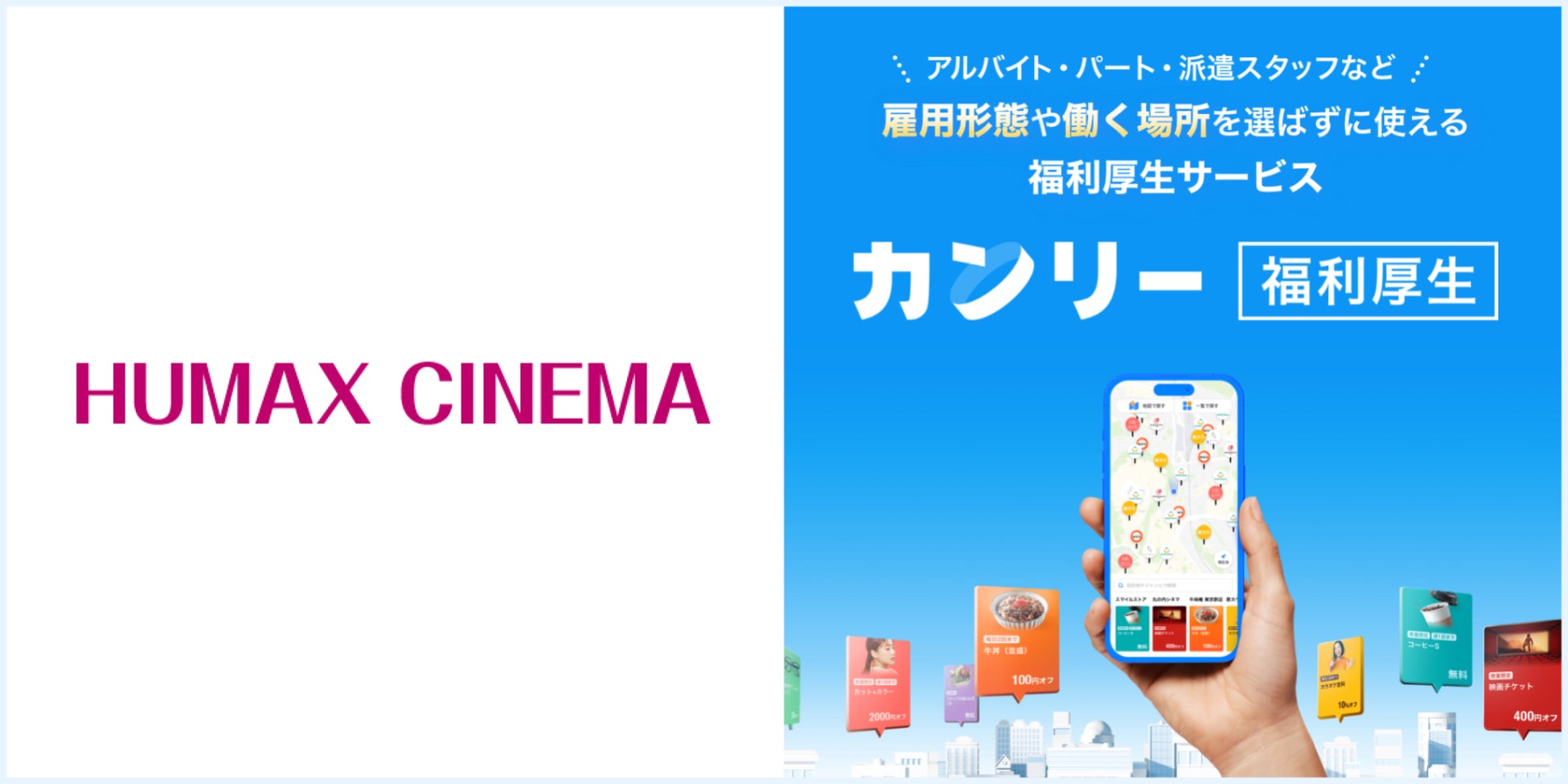 マップで簡単検索!毎日使いたくなる福利厚生サービス「カンリー福利厚生(フクリー)」に”HUMAX CINEMA ”の限定クーポンが掲載決定!全国4劇場で利用可能!