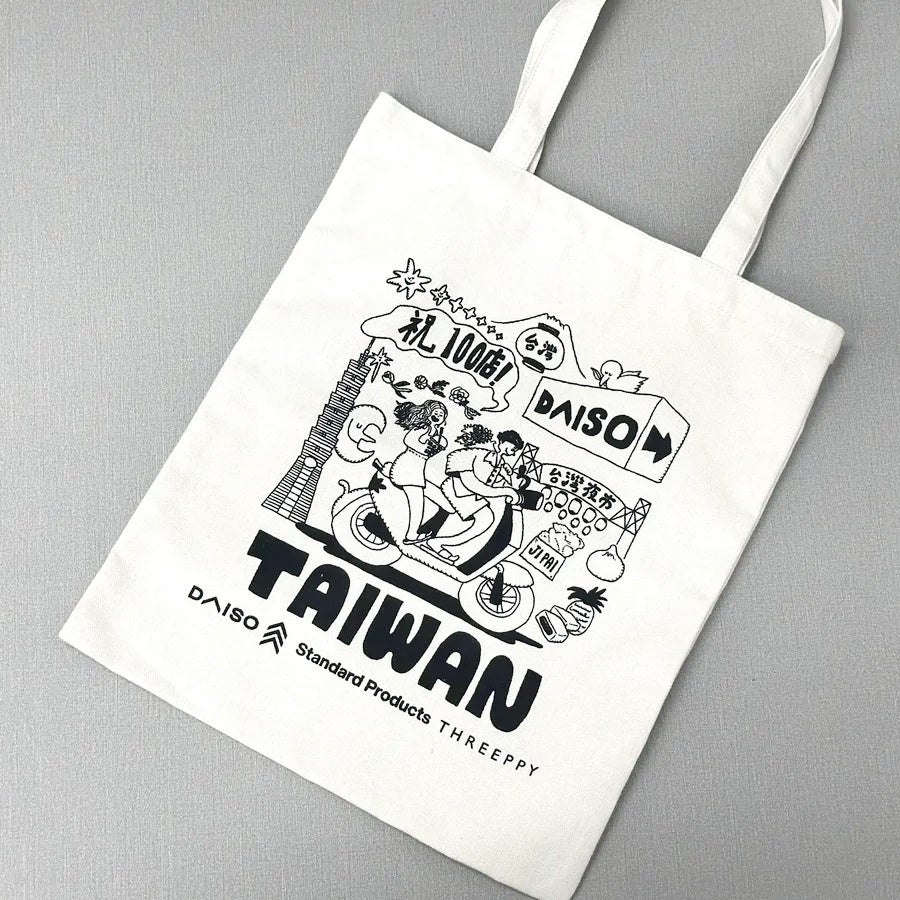 3ブランド合計100店舗達成を記念し、台湾全店舗にて6月27日から29日までの3日間限定でキャンペーンが開催され、日本でもノベルティデザインをいただいているイラストレーターの村上信理(むらかみしんり)さんオリジナルデザインのトートバッグをプレゼントいたしました。村上信理さんのデザインによる、海外でのノベルティ展開は今回が初めてです。