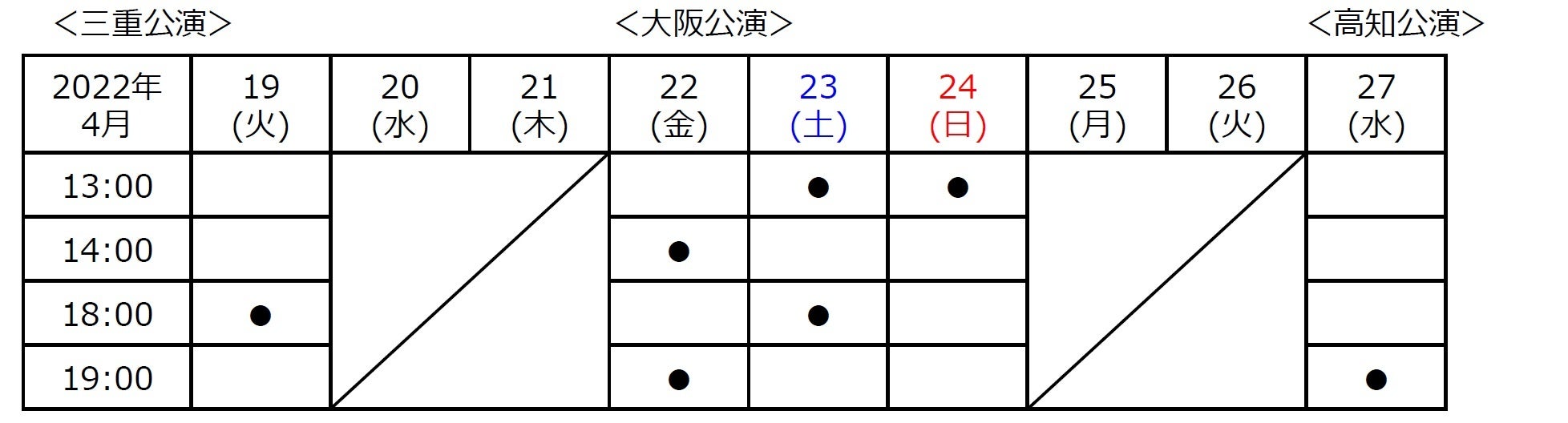4/8(金)から東京・サンシャイン劇場を皮切りに三重・大阪・高知・愛知の5都市を巡ります。詳細なスケジュールは次ページ以降をご参照ください。