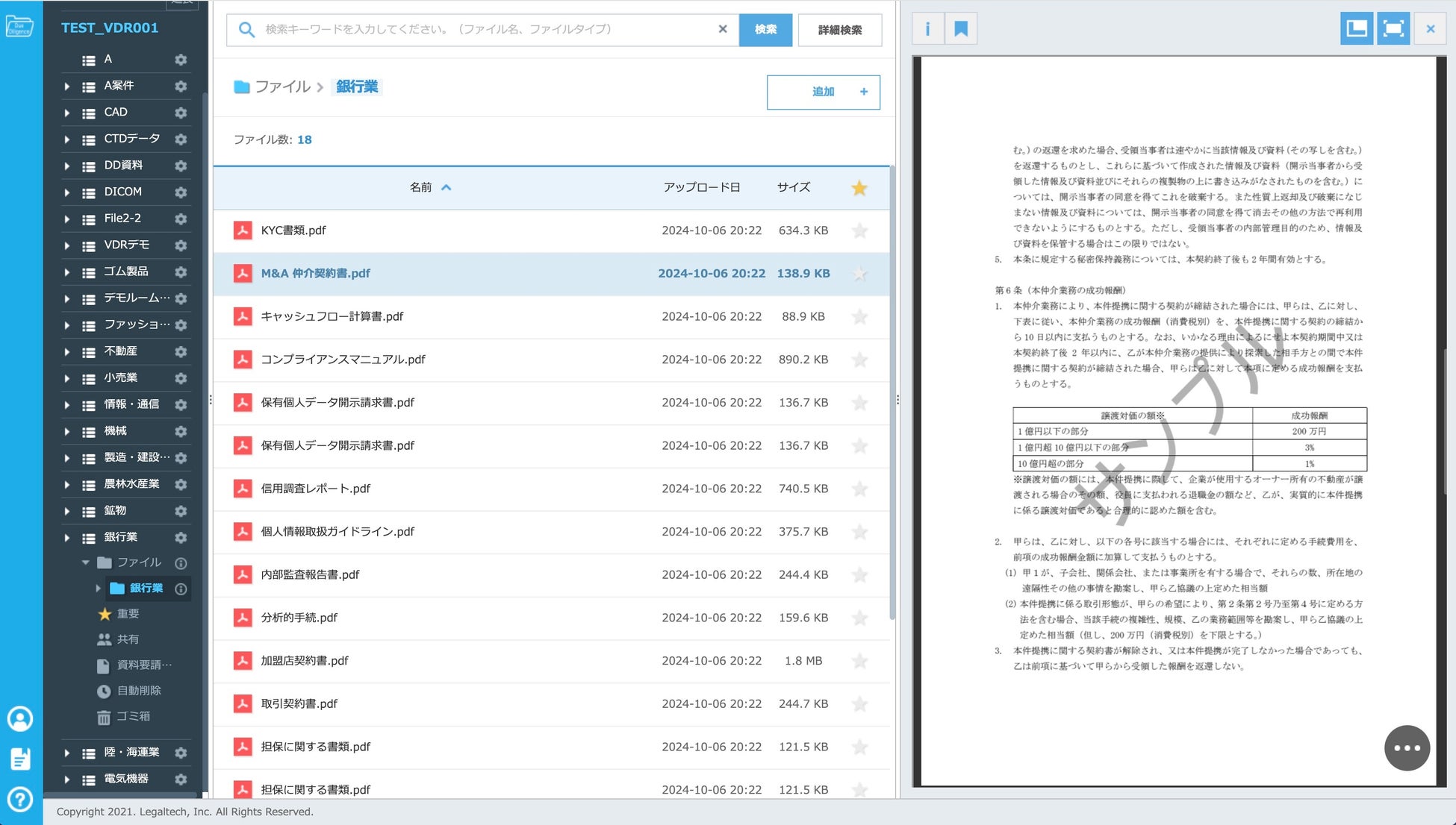 「リーガルテックVDR 銀行業」は、企業間での機密データの管理と共有を効率的かつ安全に行うためのクラウドベースのプラットフォームで、特に法務関連の業務やM&Aなどの場面で広く利用されています。以下は、「リーガルテックVDR 銀行業」が提供する具体的な機能です。