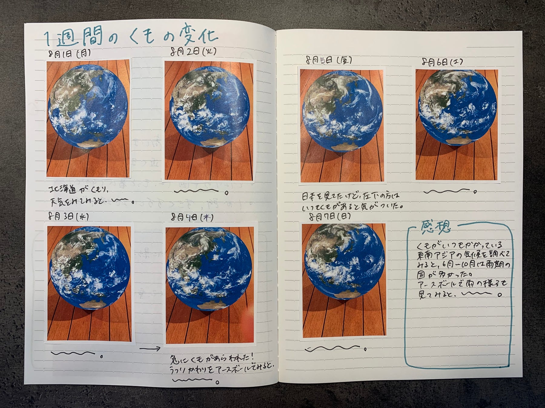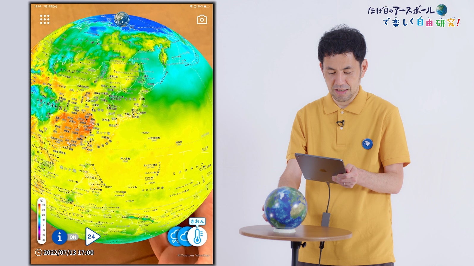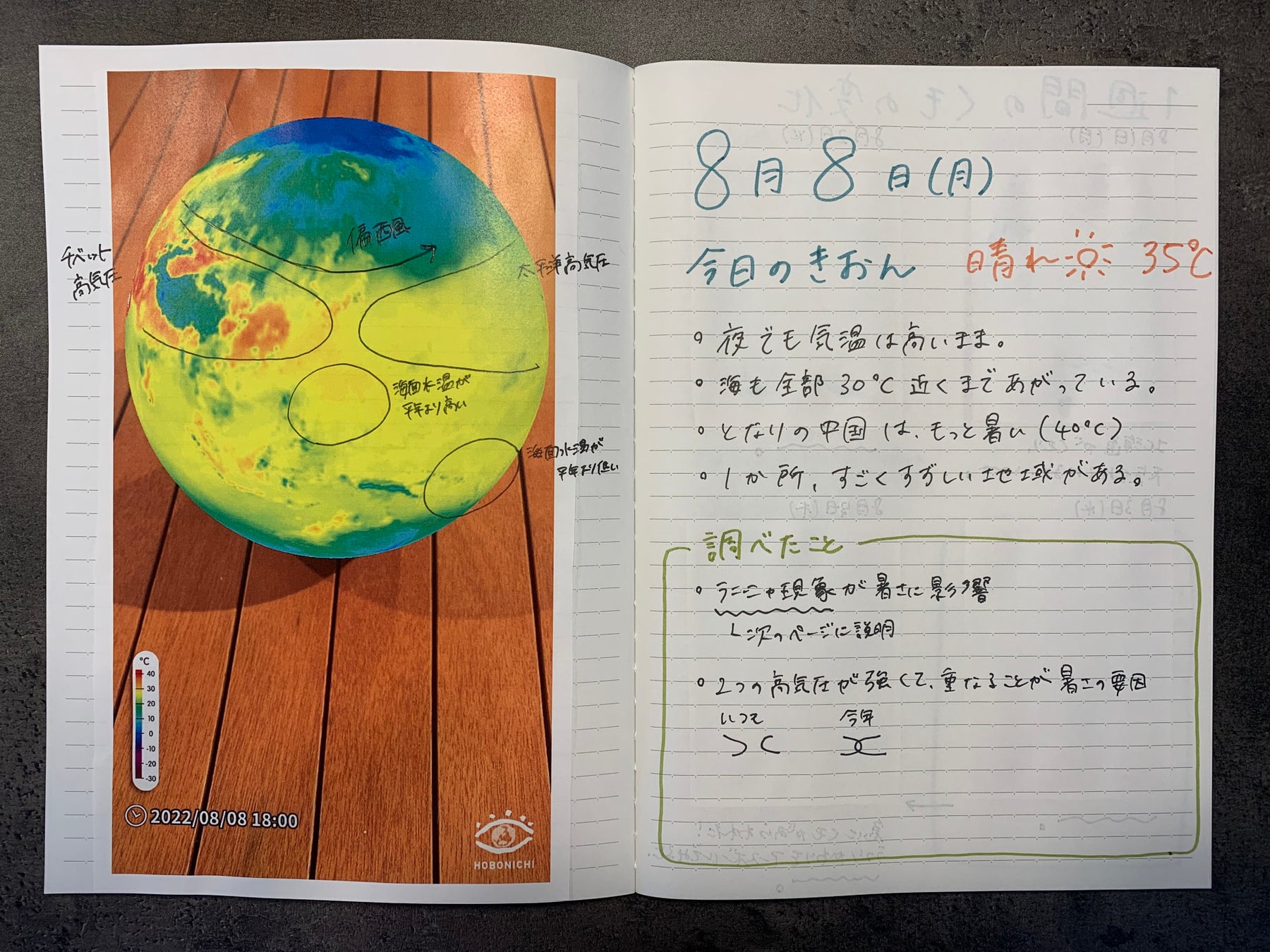 地球上でリアルタイムに変化する「雲・雨・気温」の様子が見られる人気コンテンツ「いまの地球」から、「気温」を使った自由研究です。地球上の気温が色で分けて表示されるので、気温が高い場所、低い場所が一目でわかります。毎日、「ほぼ日のアースボール」でいまの地球の気温を見ながら、「今日の日本より熱い国は?」「なんでこの地域だけ、気温が低いの?」など、気づいたことや疑問に思ったことをノートに記録してみると、いろんな発見があるかもしれません。