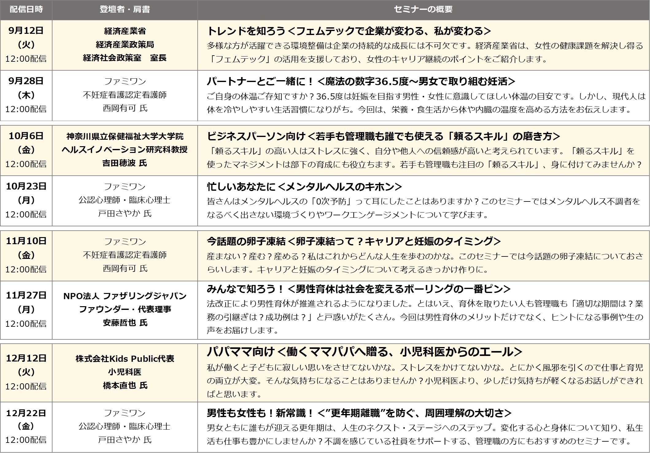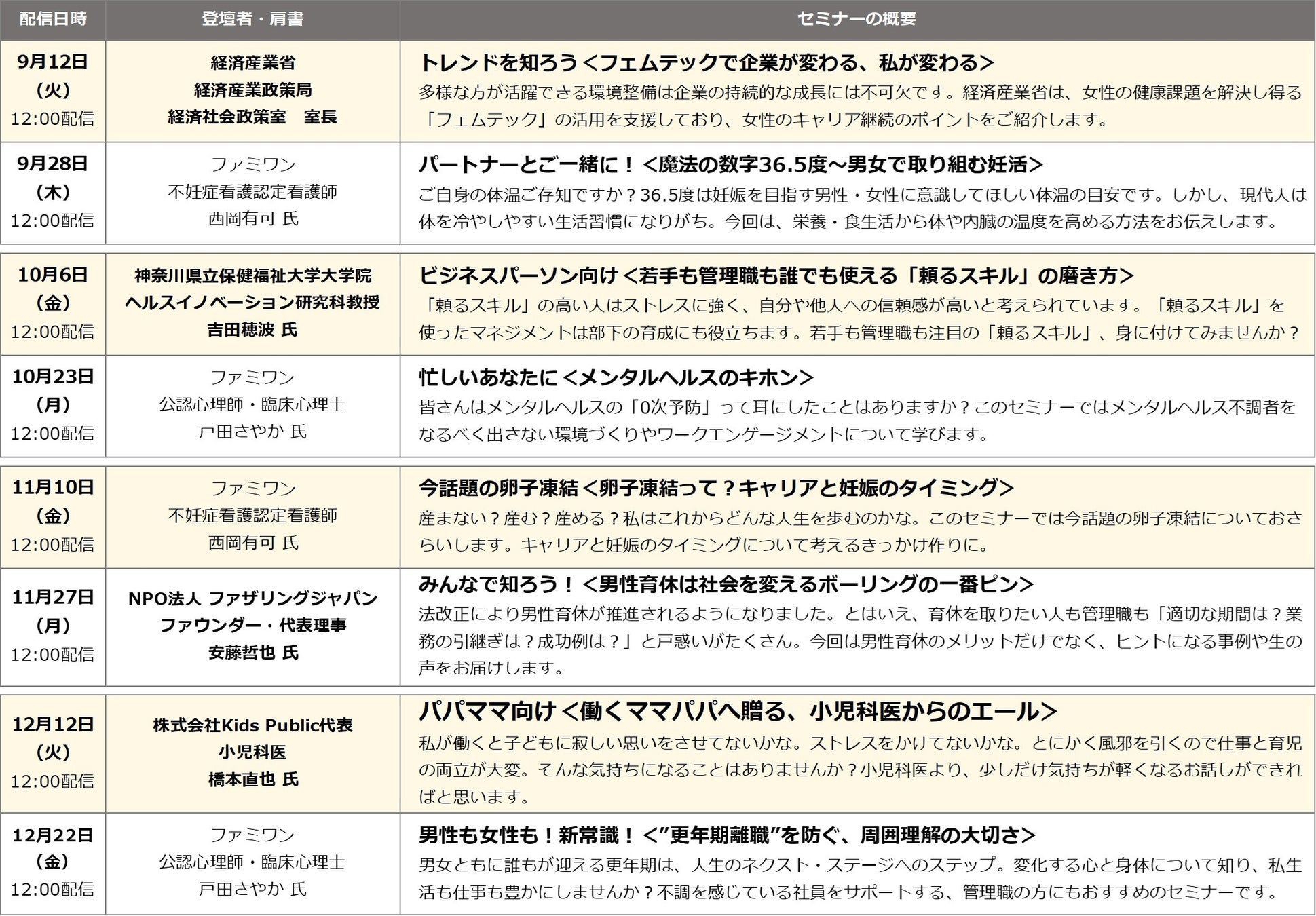 女性の健康課題全般から、パートナーシップ、ライフプランなどのテーマのほか、本年度はファミワンだけでなく外部講師による講演もオンラインで配信します。
