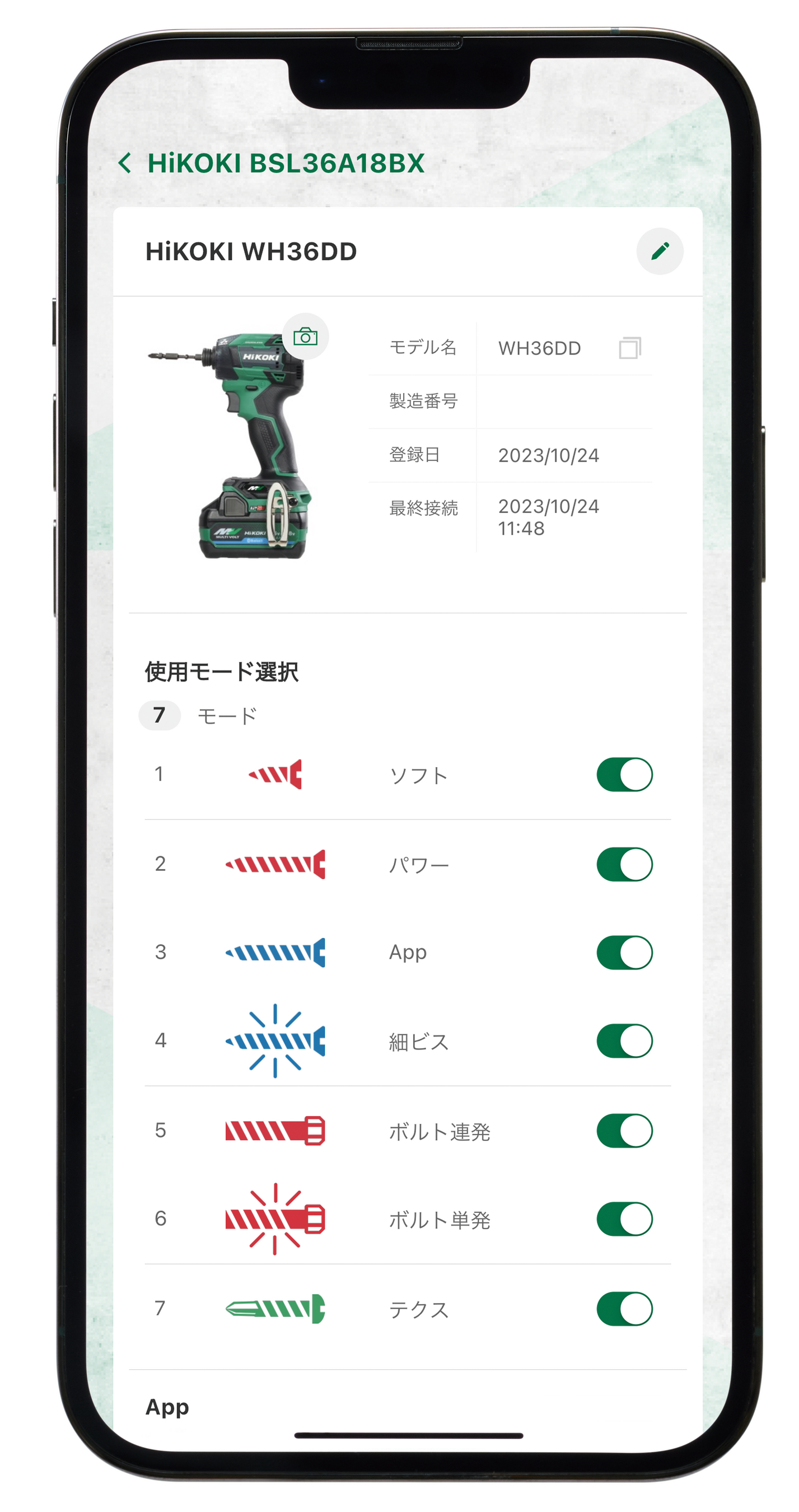 Bluetooth蓄電池(BSL36A18BX等)を取り付けると、HiKOKI TOOLSアプリから以下の項目が設定できます。スマートフォンにアプリをダウンロードしBluetooth®で連携することで、スイッチの遊びや回転数などを自由に調整できます。