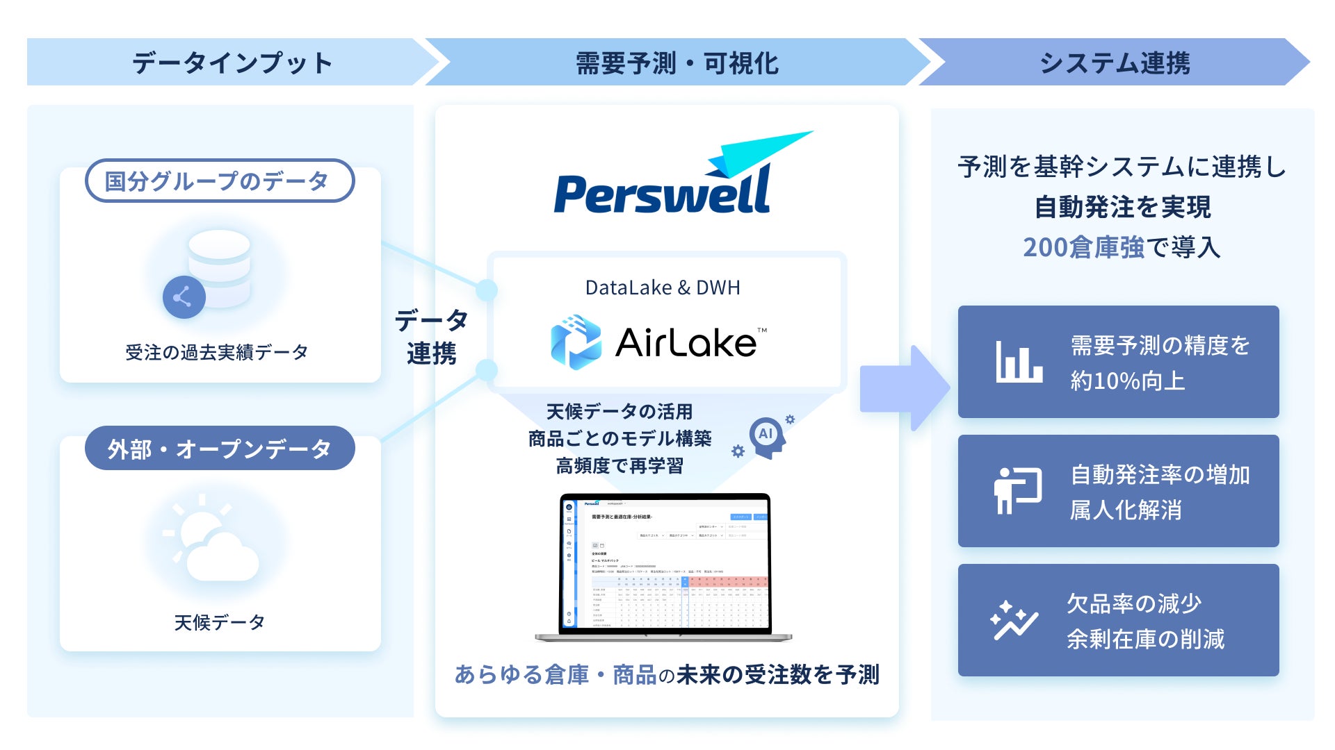 DATAFLUCT、国分グループの物流拠点200倉庫強で需要予測AIサービス「Perswell」を導入。予測精度を約10%改善し、商品の需要予測と自動発注を実現