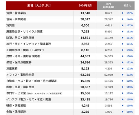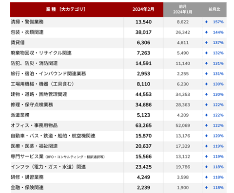前月比で最も伸びている業種は前月に引き続き「清掃・警備業務」でした。「清掃」「警備」などの業種は、年間を通じた契約の案件が多く、年度末に向けて案件が増えてくる傾向にあります。