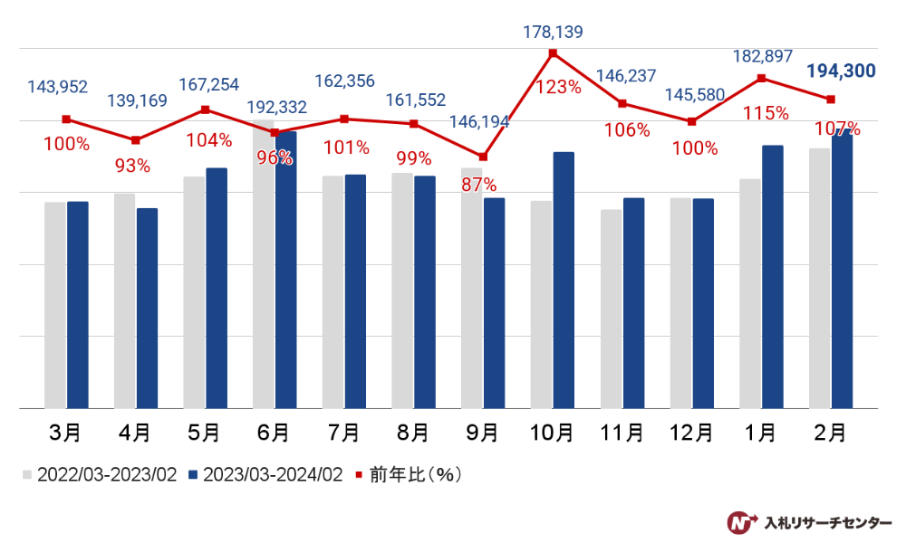2024年2月の公示案件数の総計は194,300件で、前年比107%となりました。