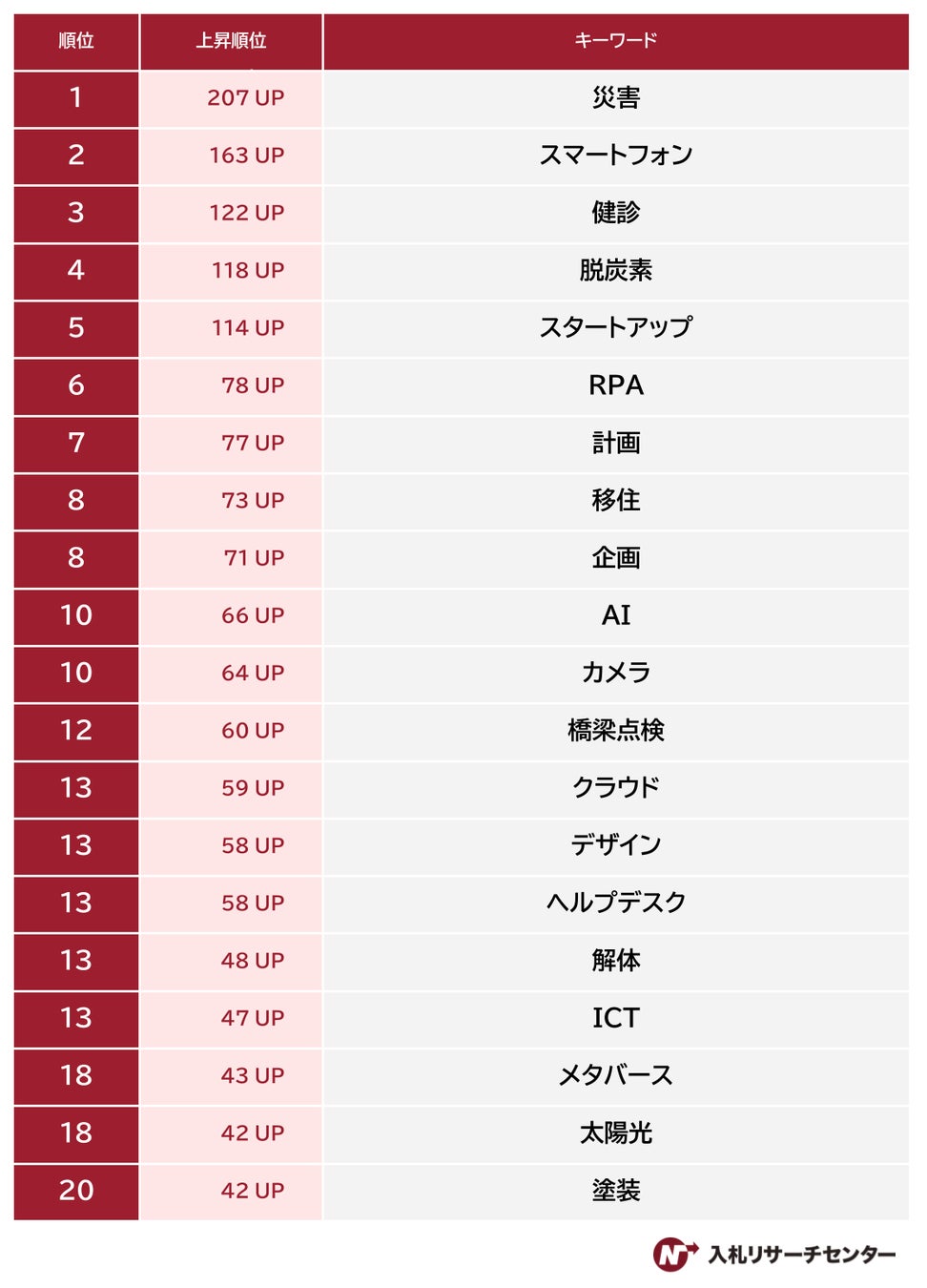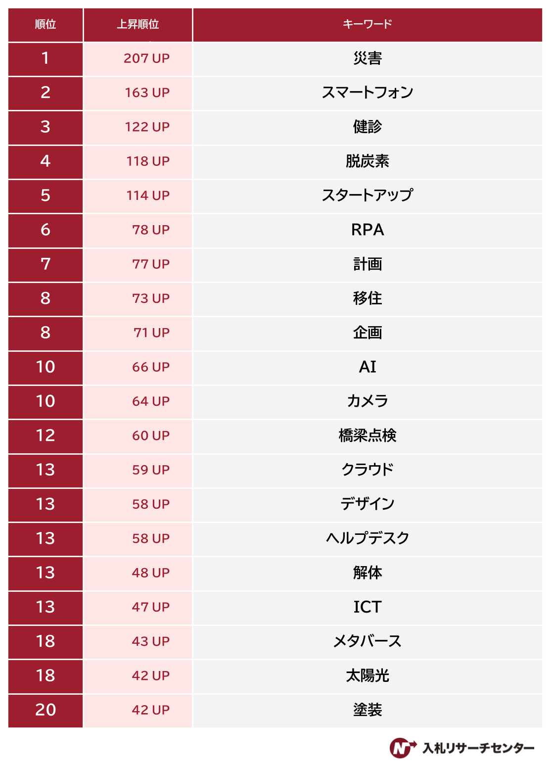・入札情報速報サービスNJSSユーザーが検索したキーワードを元に、前月と比較して上昇幅の大きいキーワードをランキング