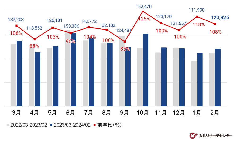 2024年2月の落札案件数の総計は120,925件で、前年比108%となりました。