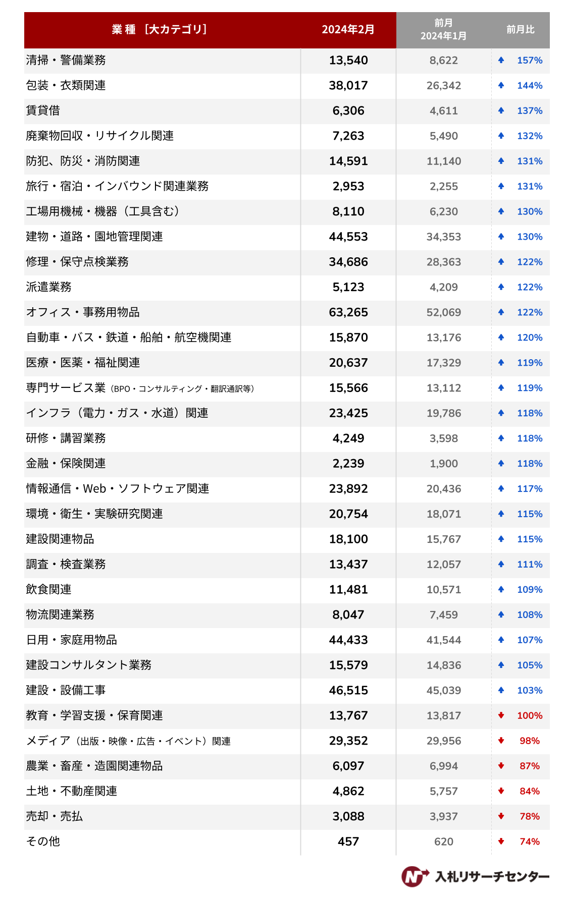 2024年2月の業種カテゴリ別 公示案件数は、前月より増加傾向となりました。