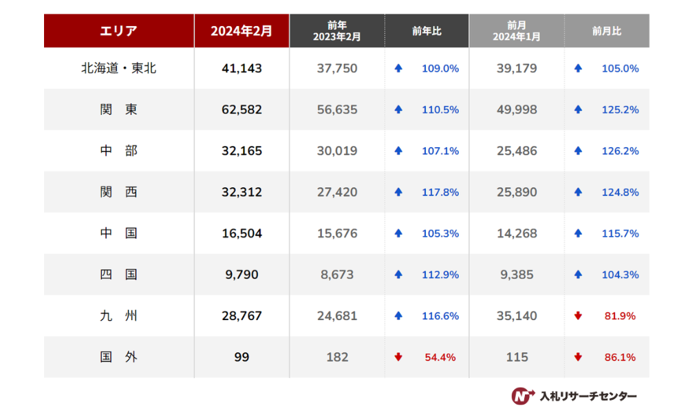2024年2月のエリア別公示案件数は、全体的に前年より増加傾向となりました。
