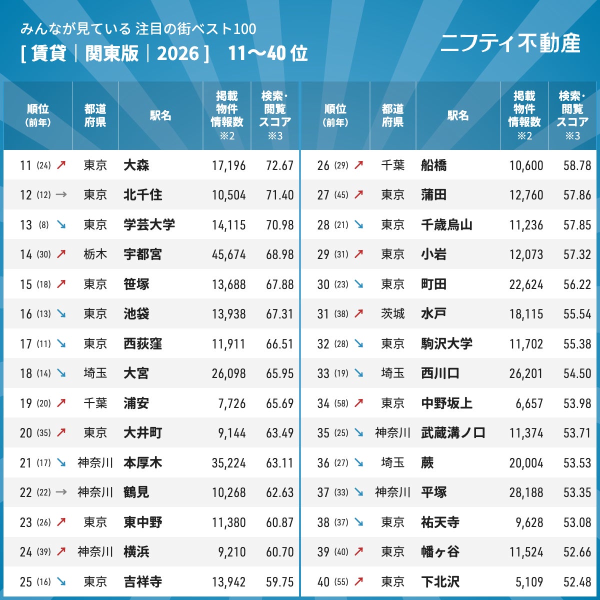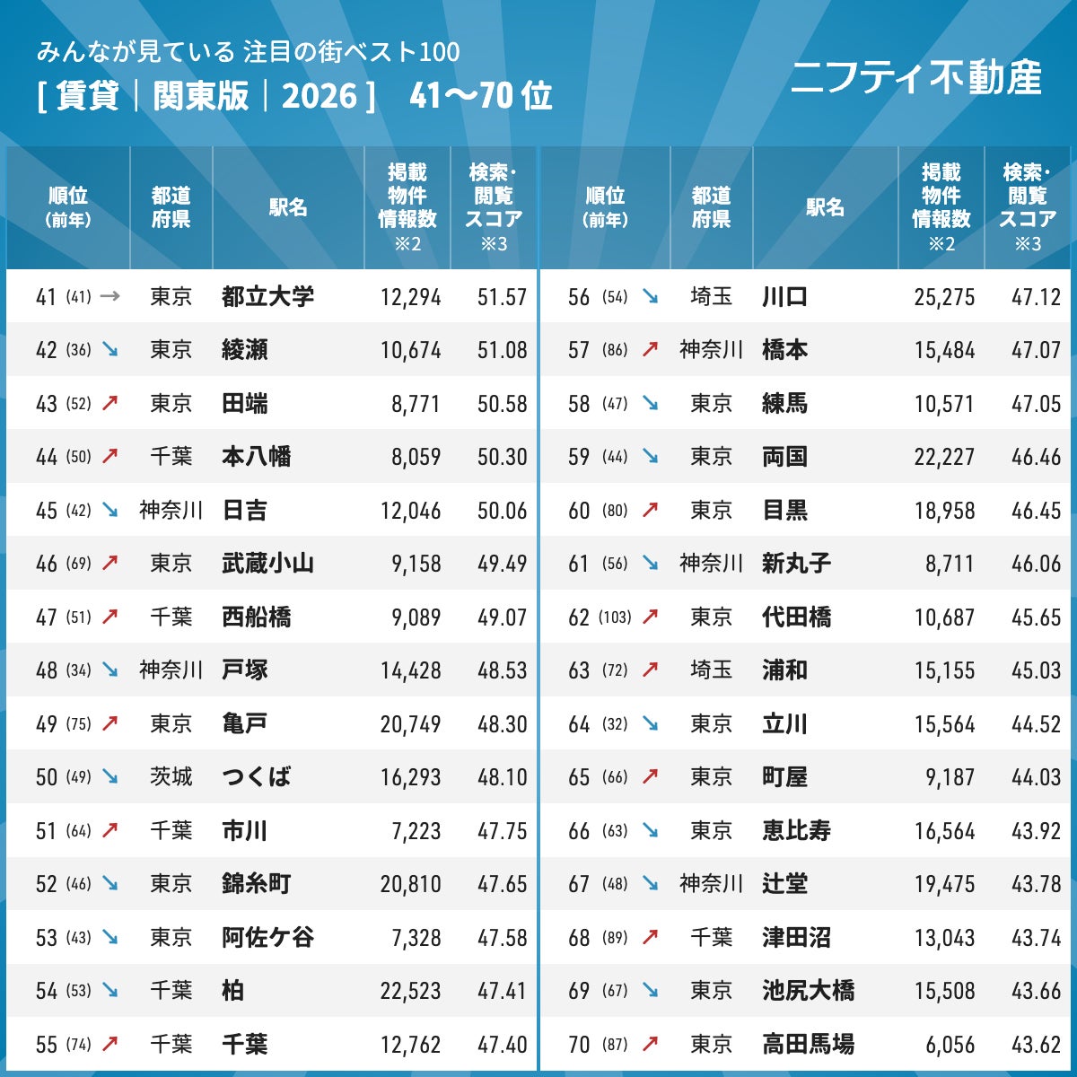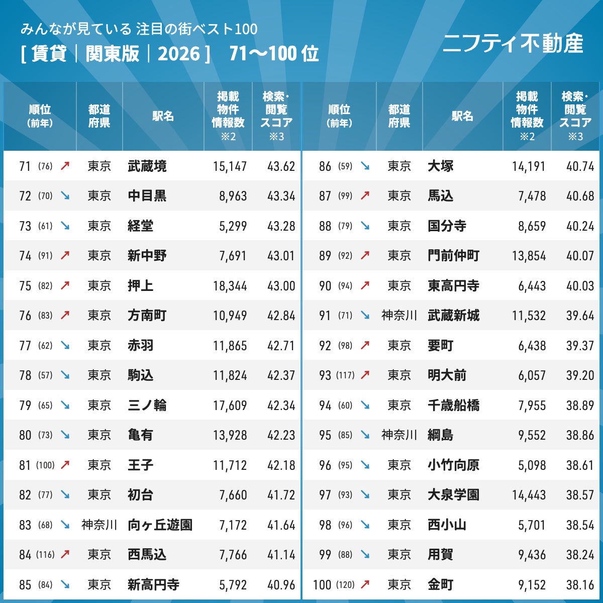 【関東ベスト100】注目の街年間ランキング2026発表!「川崎」が2年連続首位、交通利便性と住みやすさで支持拡大【ニフティ不動産】