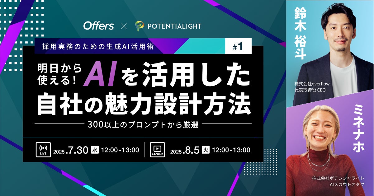本セミナーでは、日々採用支援に取り組むポテンシャライト社が、試行錯誤を重ねて蓄積してきた300以上の生成AIプロンプトの中から、厳選したノウハウを大公開。実際の事例やデモを交えながら、現場ですぐに使える具体的な活用術をわかりやすく解説します。