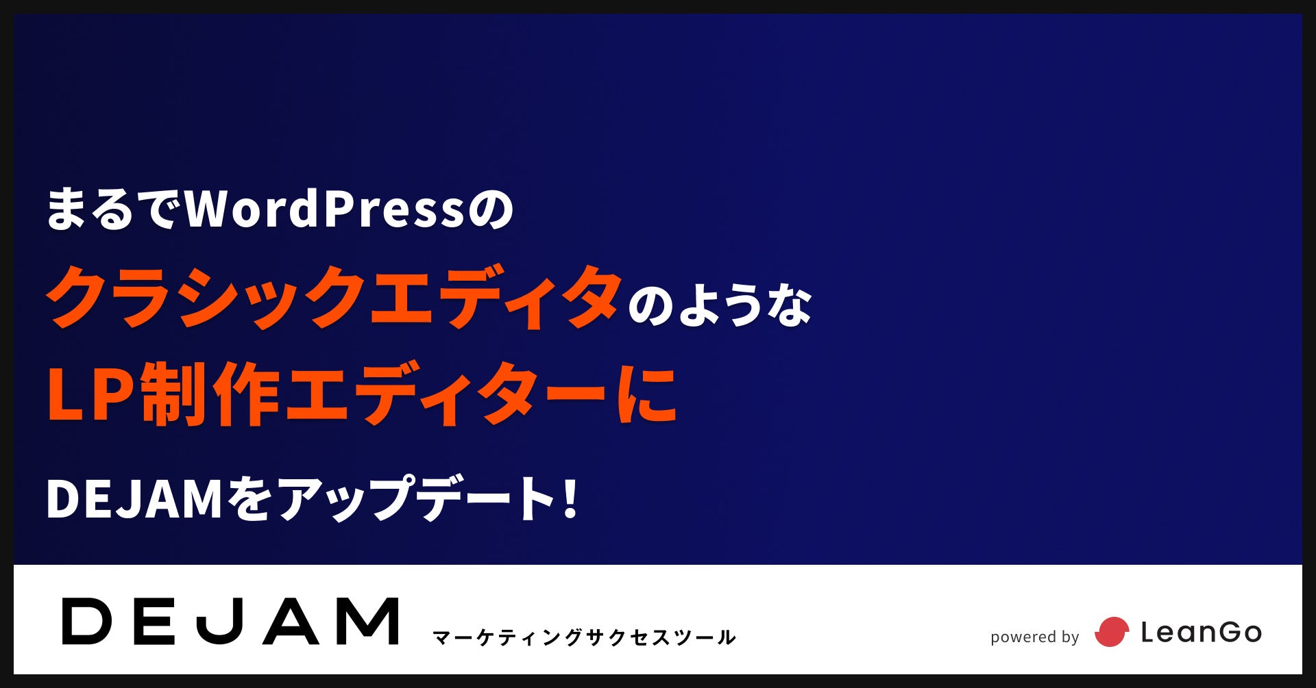 株式会社LeanGo (本社:東京都目黒区、代表取締役:平井 翔吏、以下 弊社) は、自社の運営するマーケティングサクセスツール「DEJAM( https://leango.co.jp/dejam/ )」がまるでWordPressのクラシックエディタのようなLP制作エディターにDEJAMをアップデートしたことをお知らせします。