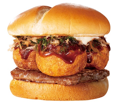 大粒のたこ焼き3つを大胆にも挟んだ、見た目にもユニークな期間限定バーガーです。100%ビーフパティも入って食べ応えも抜群!