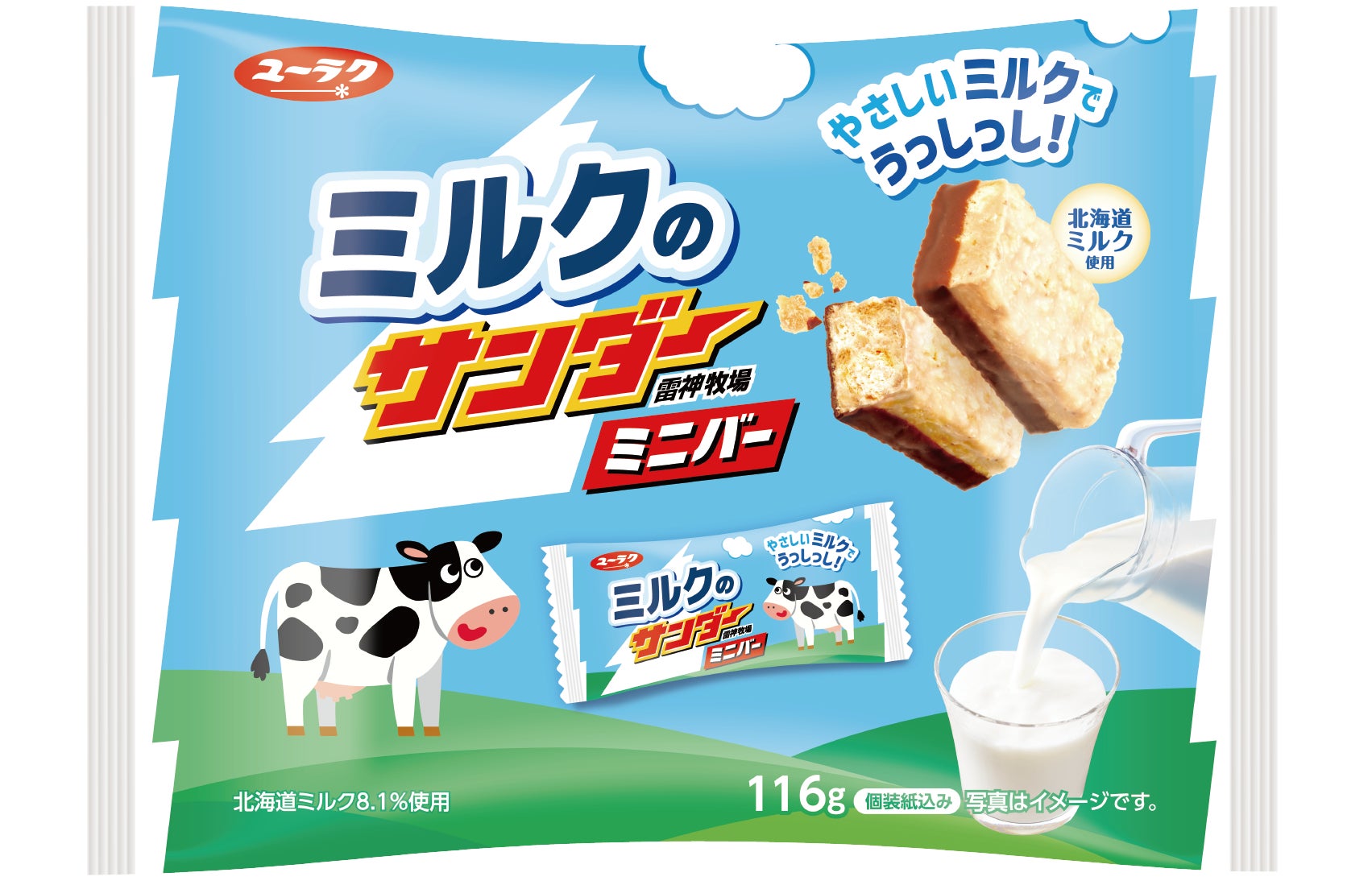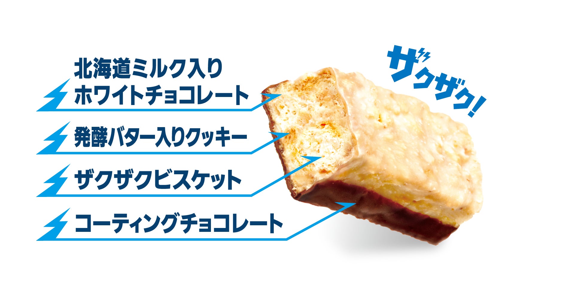 2024年2月に発売し、ご好評をいただきました「ミルクのサンダー」がミニバーサイズになって新登場!やさしい甘さと北海道ミルクのコクが楽しめるホワイトチョコレートに、ザクザクビスケットや発酵バター入りのクッキーを組み合わせました。ミルクの味わいと心地よいザクザク食感は、ついついもう1個と手が伸びるクセになるおいしさです。やさしいミルクでうっしっし!なひとときをお楽しみください。