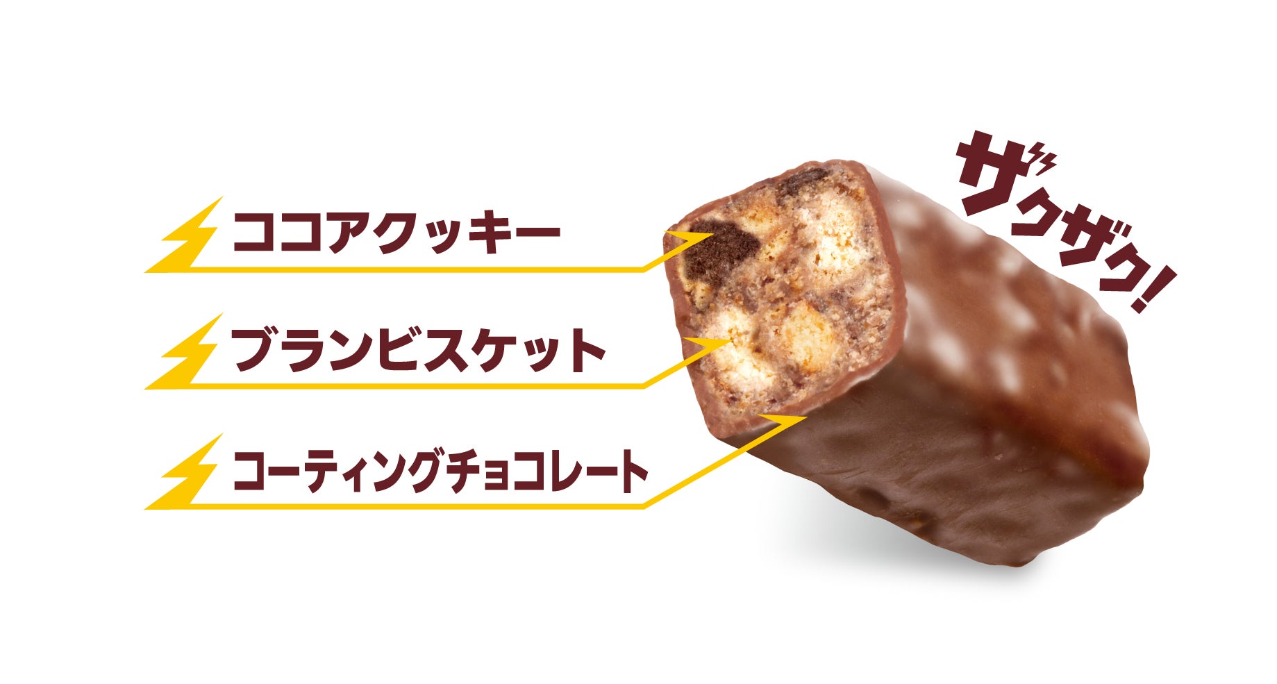 ブランビスケットと食物繊維入りの「ブラックサンダーミニバー 香ばしブラン」が新登場!全粒粉と小麦ふすまを配合したブランビスケット、ザクザク食感のプレーンビスケット、ほろ苦い味わいのココアクッキーを組み合わせました。香ばしい香りとザクザク食感をご堪能いただけます。また隠し味にコーヒー粉末を配合することで、さらに香ばしさが加わり味わいに深みを与えています。ザクザクうれしい全粒粉入りのおいしさをお楽しみください。
