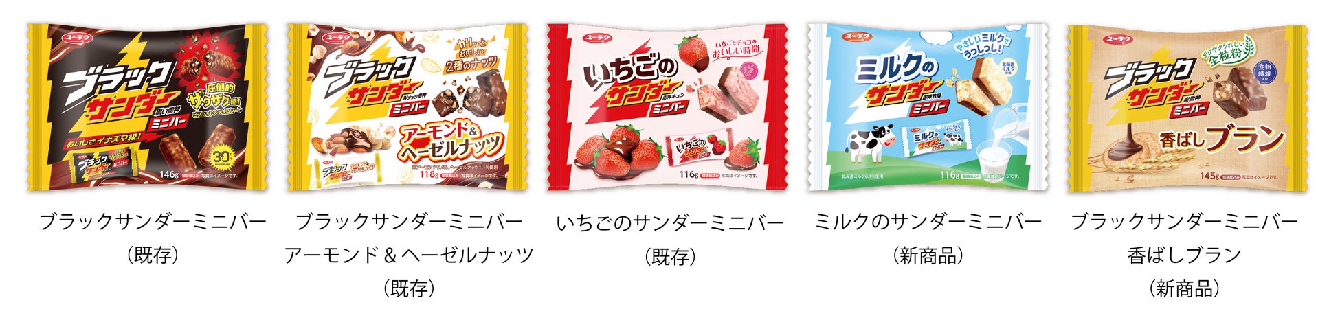 この度、新商品として「ミルクのサンダーミニバー」と「ブラックサンダーミニバー 香ばしブラン」を発売します。新しい仲間が加わり、さらにパワーアップしたブラックサンダーミニバーシリーズをお楽しみください。