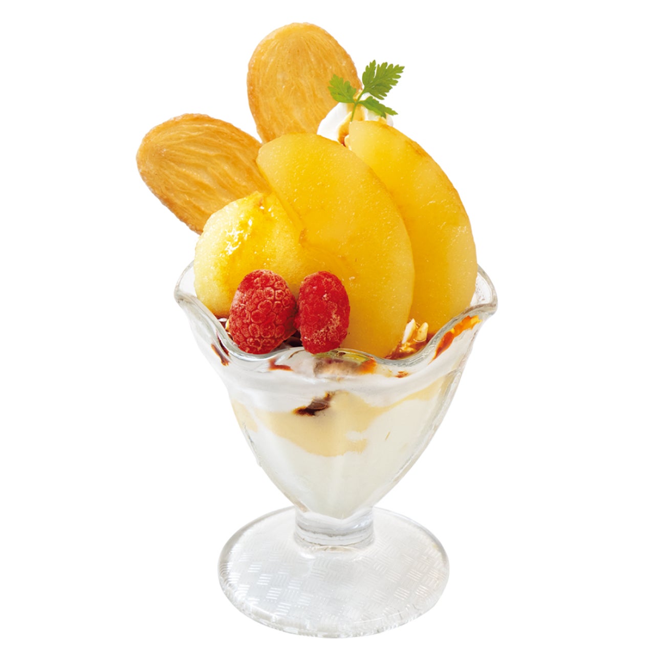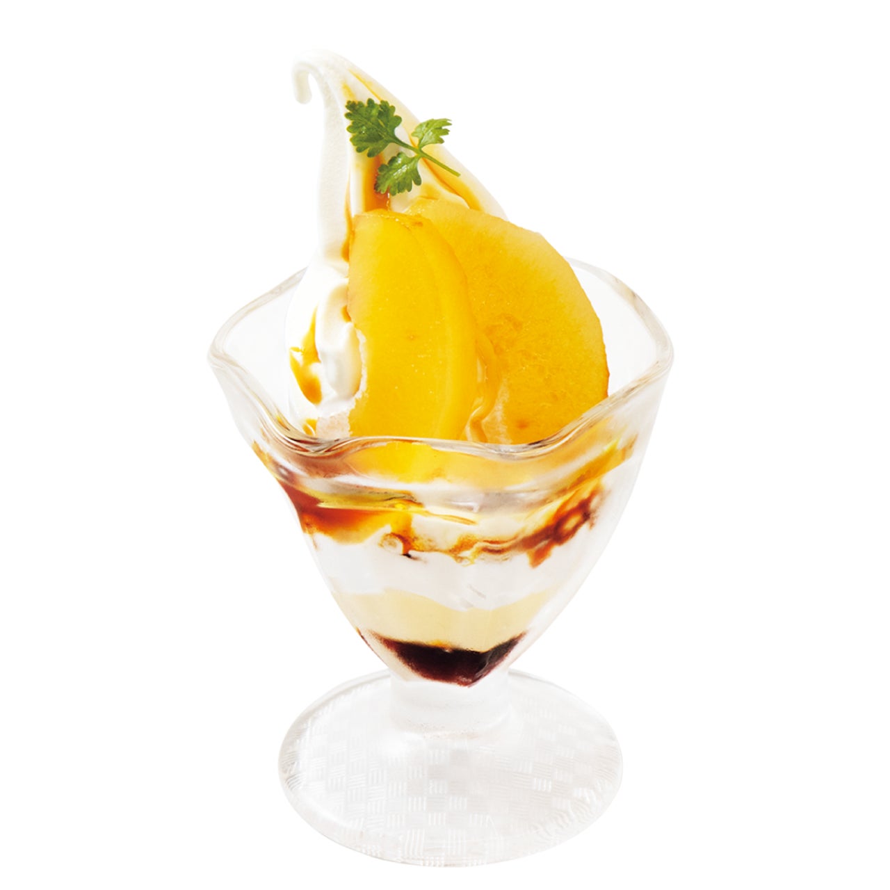 りんごのコンポート、その後ろにはりんごソルベと、りんご尽くしの贅沢パフェ。りんご好きに贈る、一品。